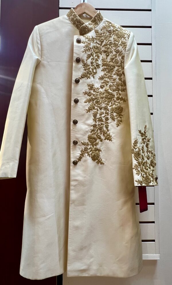 Beige Color Silk Wedding Jodhpuri Sherwani Gold Embroidery for men