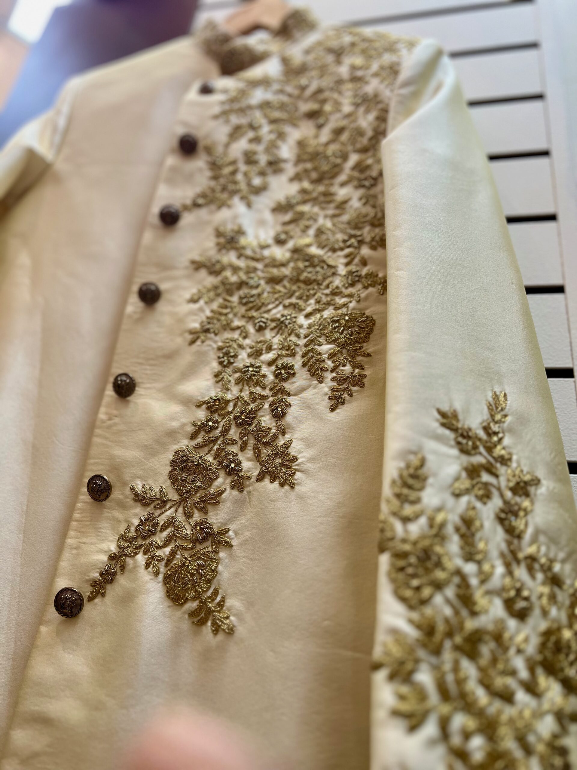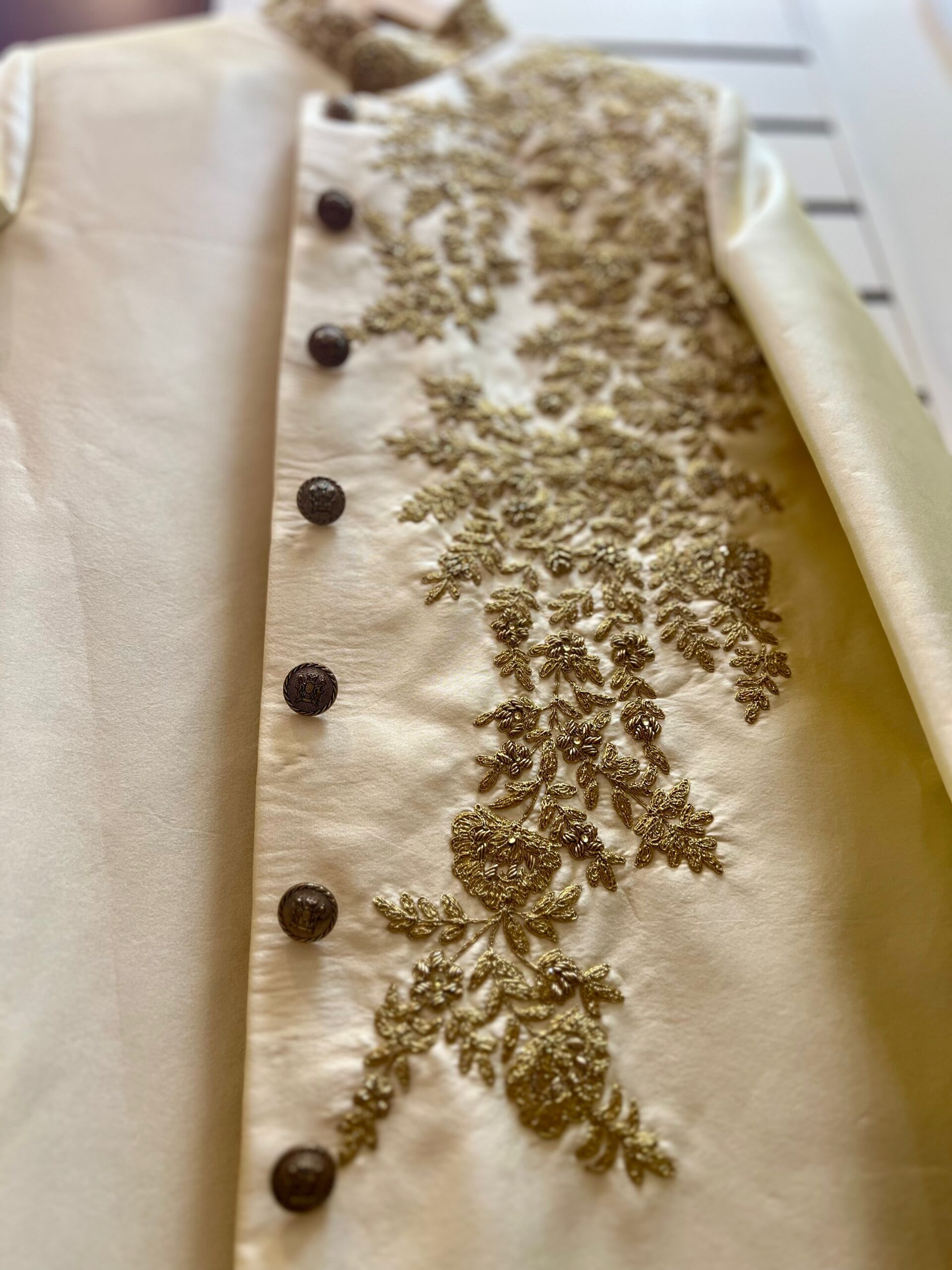 Beige Color Silk Wedding Jodhpuri Sherwani Gold Embroidery for men