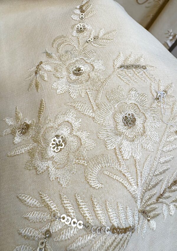 This cream-colored sherwani features intricate floral embroidery and a regal silhouette, perfect for weddings, receptions, and festive cultural events.