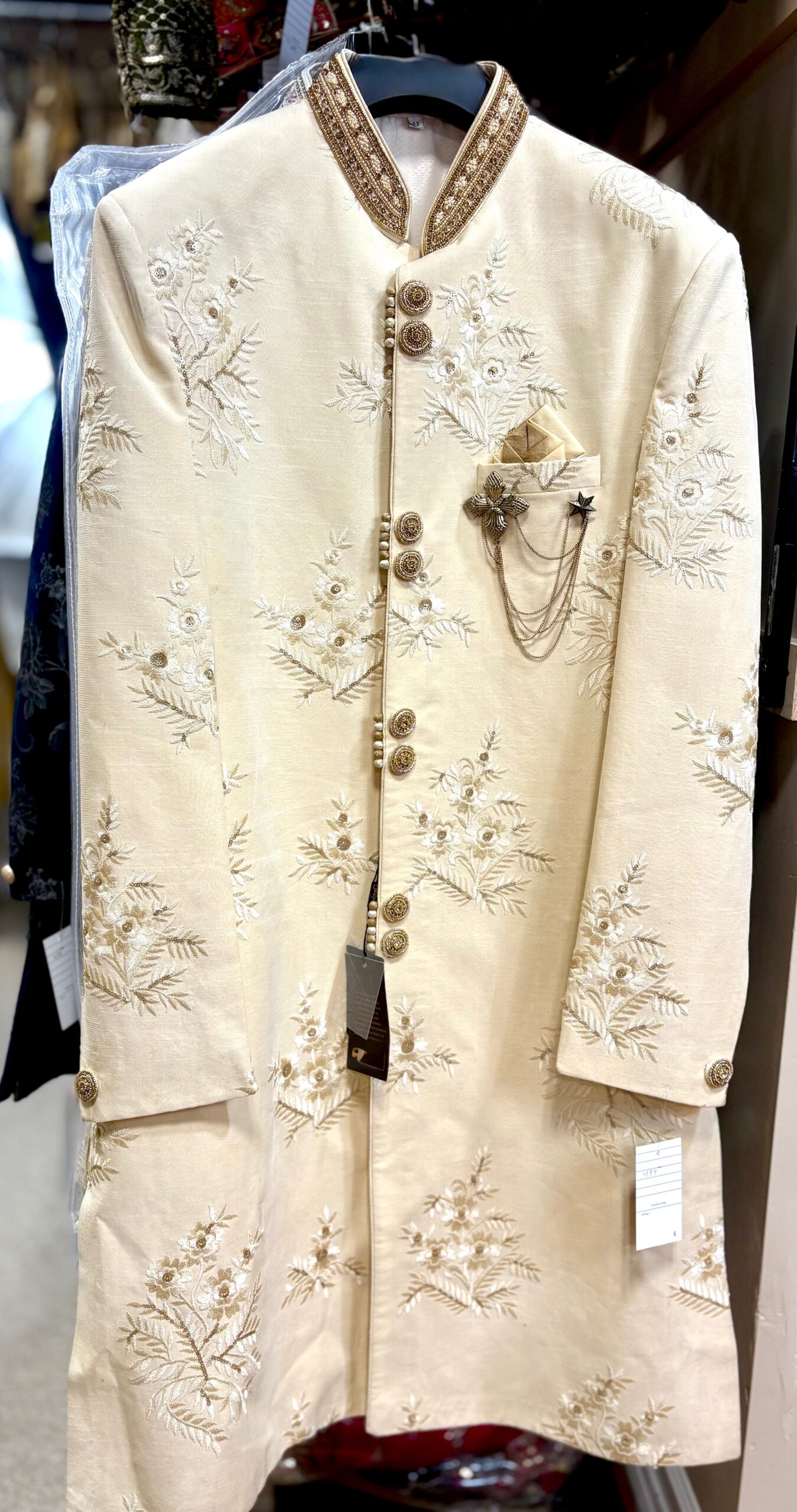 This cream-colored sherwani features intricate floral embroidery and a regal silhouette, perfect for weddings, receptions, and festive cultural events.
