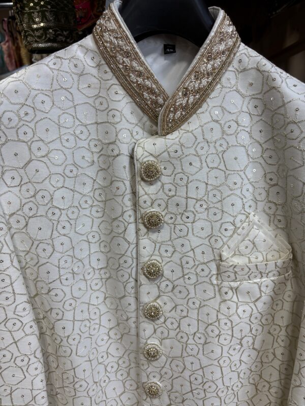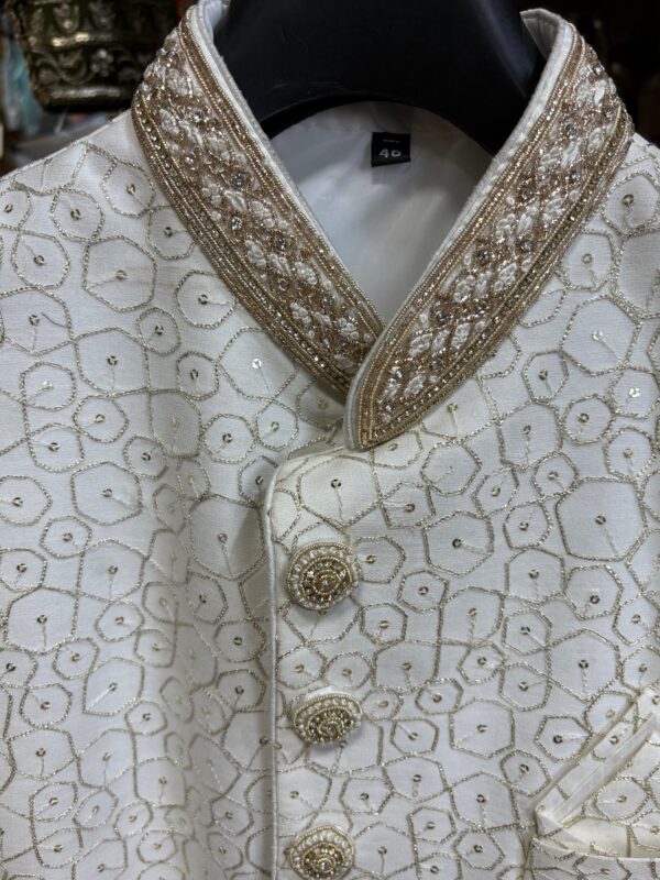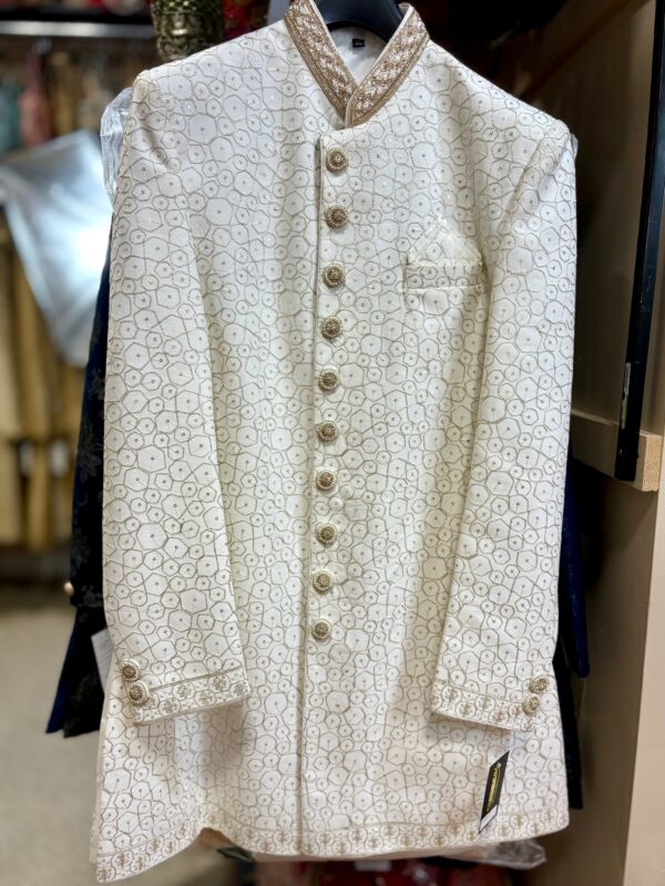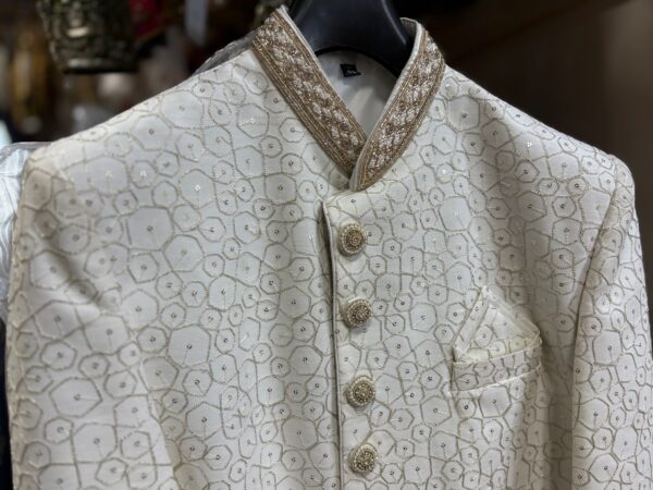 Sophisticated Royal Look: Elegant ivory sherwani featuring intricate golden embroidery for a timeless and regal appearance.