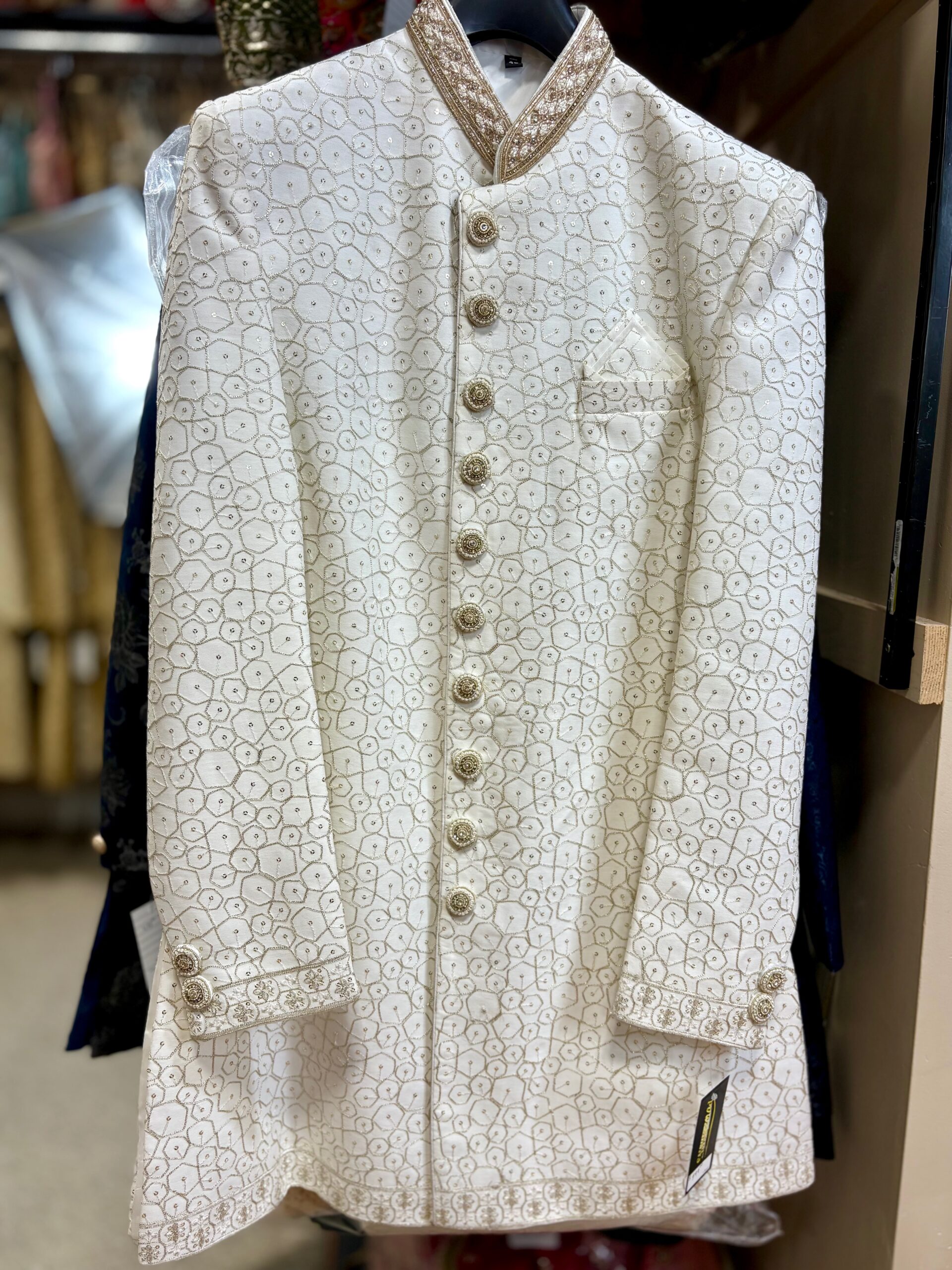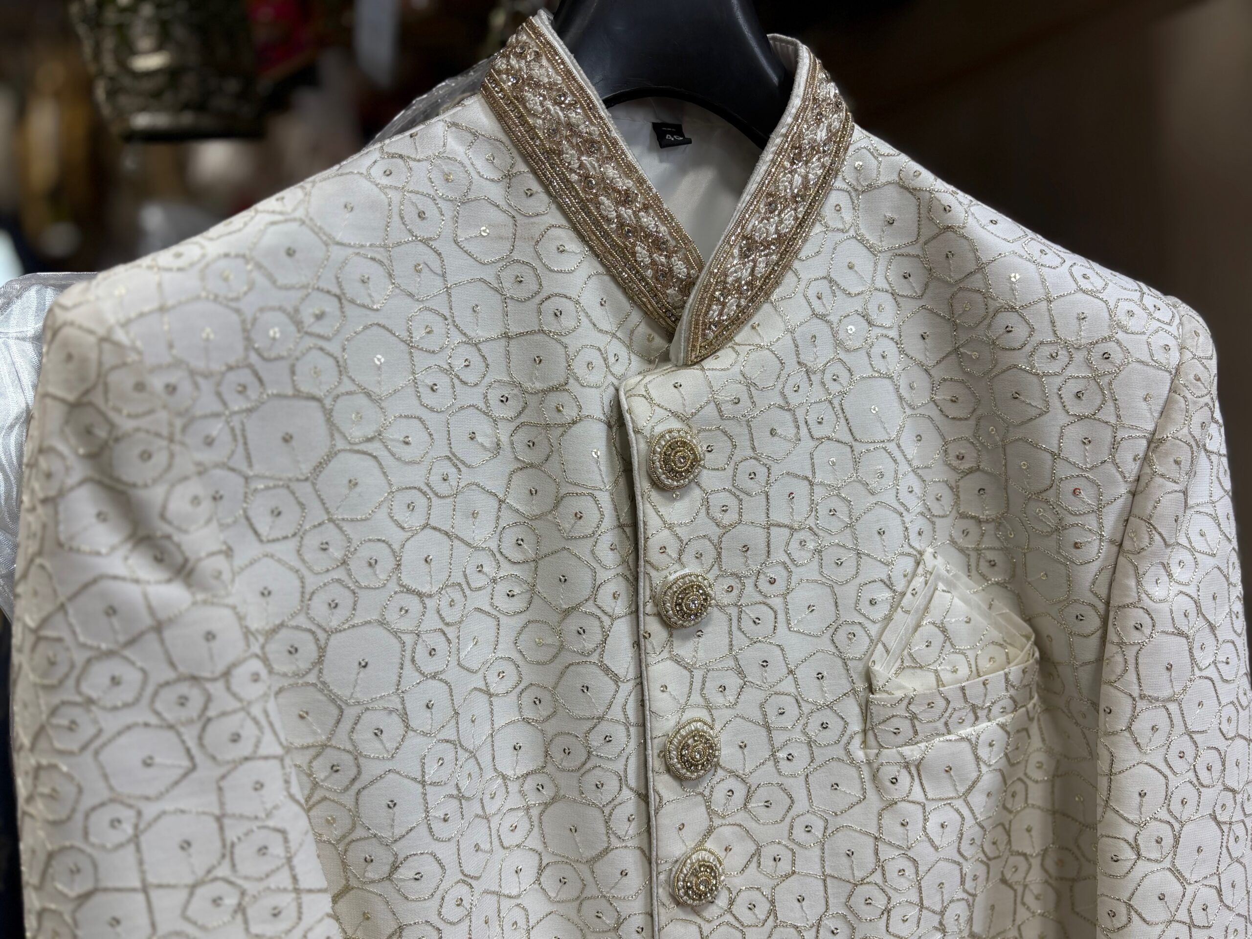 Designer Buttons: Ornate gold buttons with beaded work add to the grandeur and coordinate perfectly with the overall embroidery.