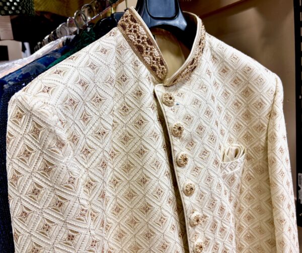 This is a sophisticated cream-colored sherwani crafted from richly textured jacquard fabric with an intricate diamond-patterned weave.