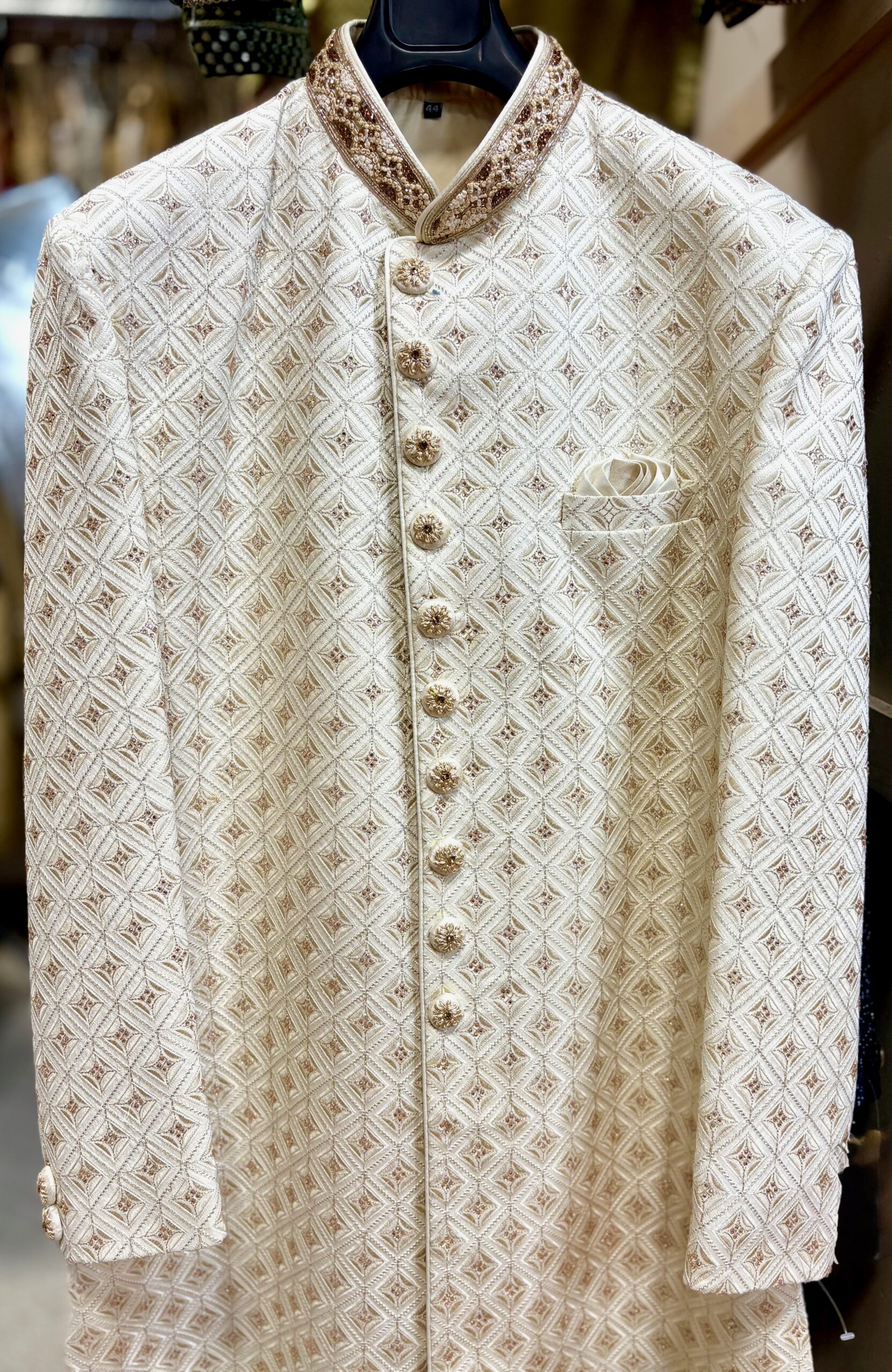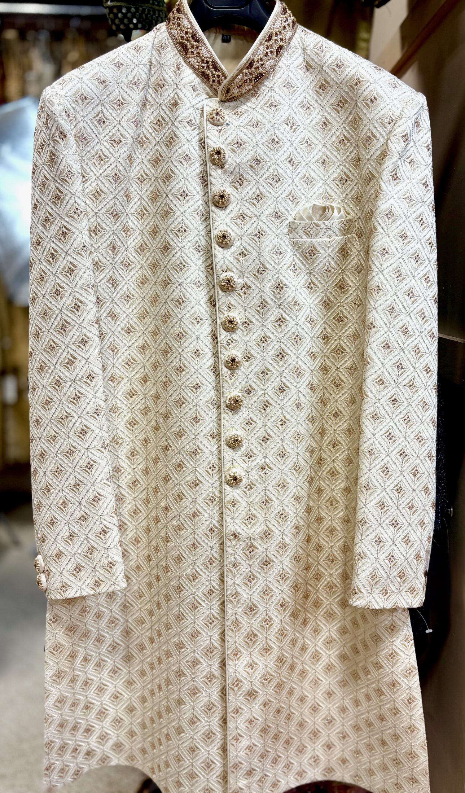 This is a sophisticated cream-colored sherwani crafted from richly textured jacquard fabric with an intricate diamond-patterned weave.
