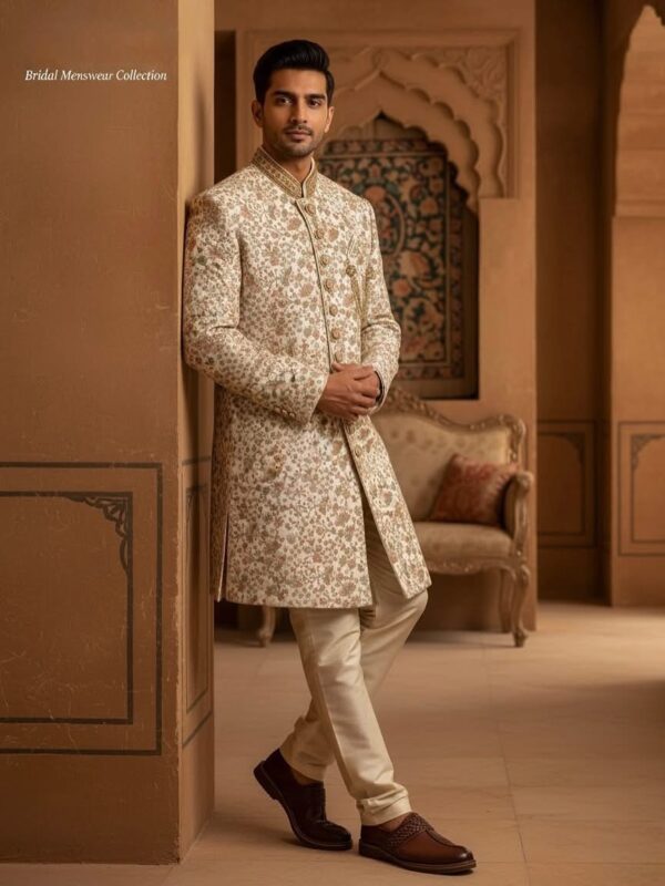 Regal Design: Exquisite cream-colored sherwani jacket beautifully adorned with intricate multicolor floral embroidery for a royal, timeless look.