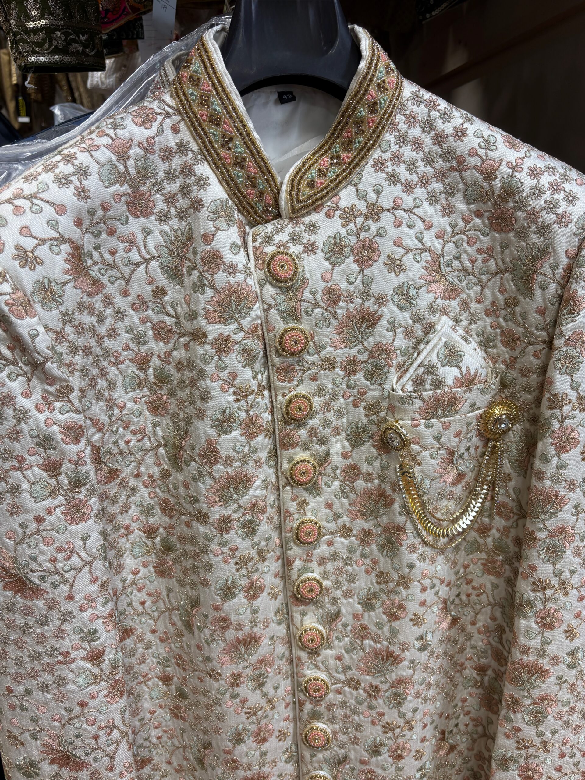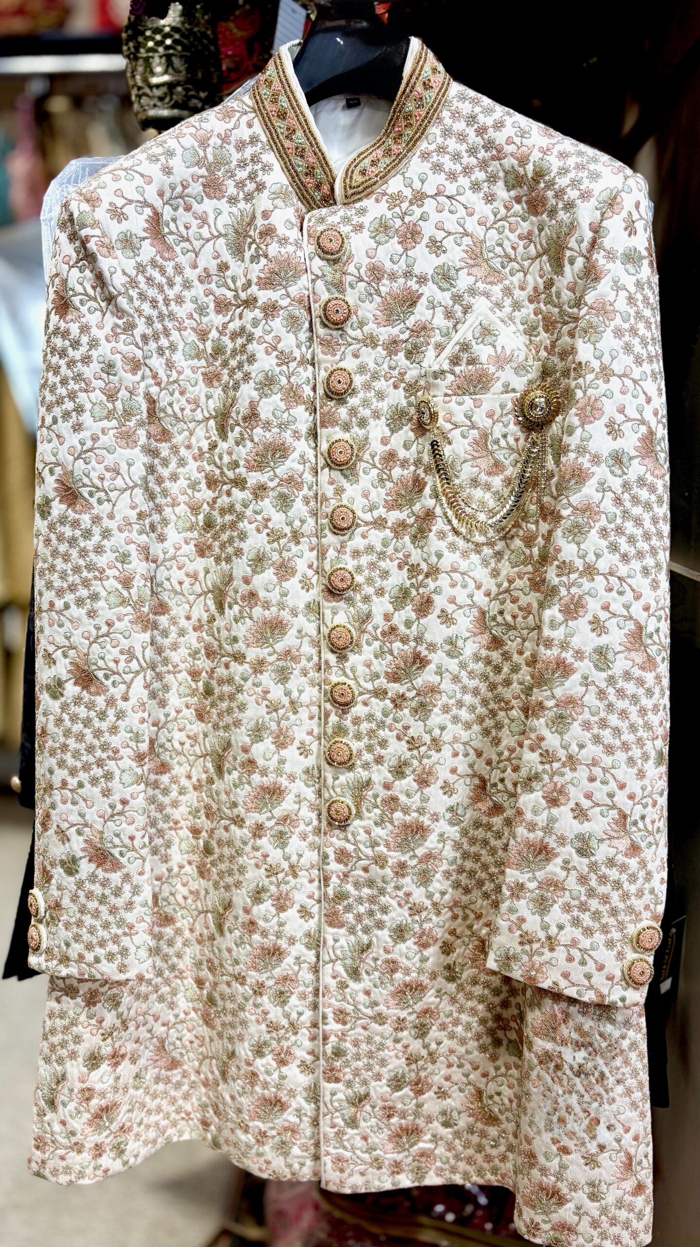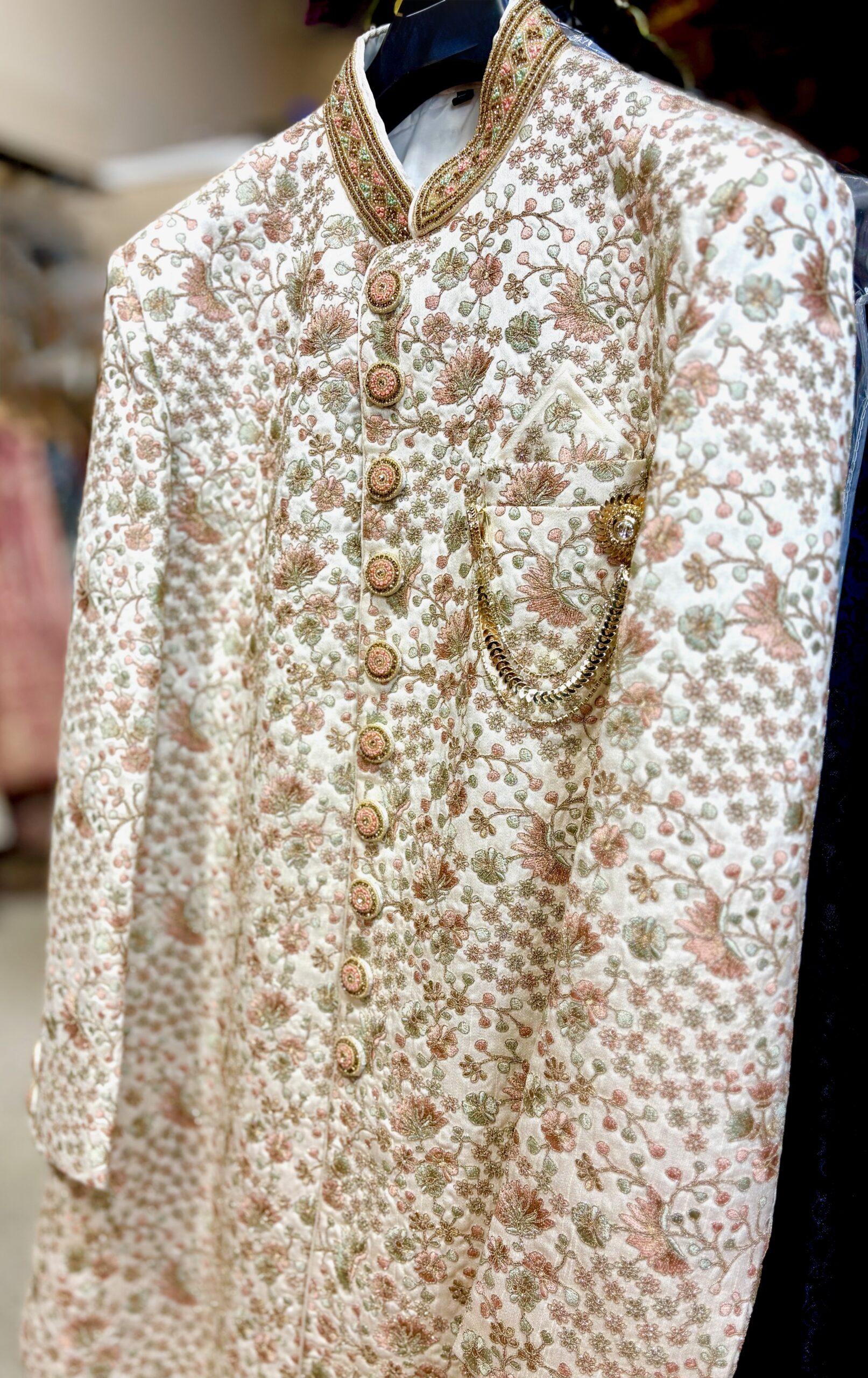 Regal Design: Exquisite cream-colored sherwani jacket beautifully adorned with intricate multicolor floral embroidery for a royal, timeless look.