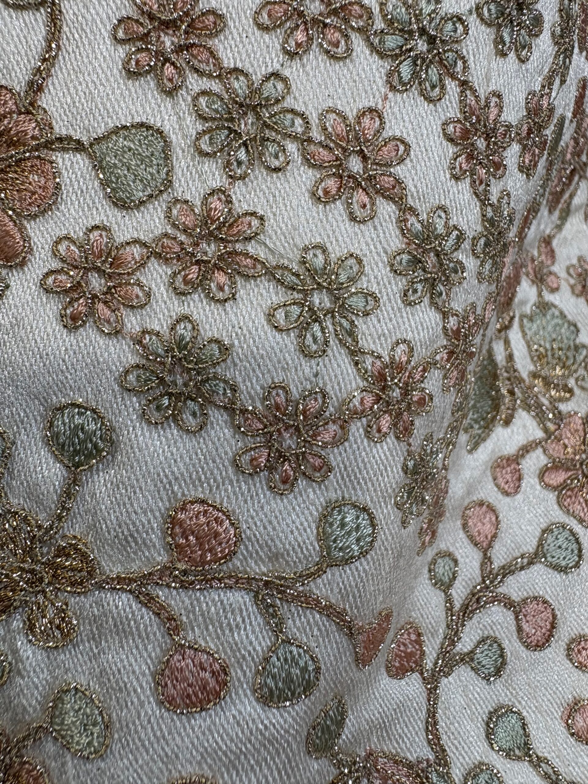 Detailed Embroidery: Features elegant threadwork in soft gold, blush pink, and sage green tones, creating a delicate and sophisticated pattern.