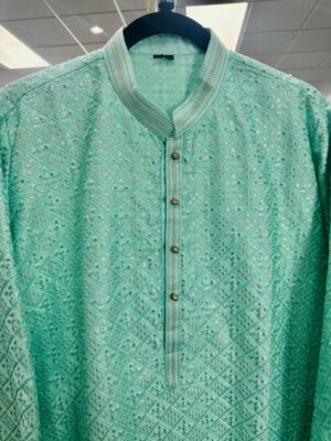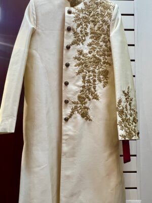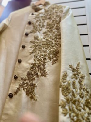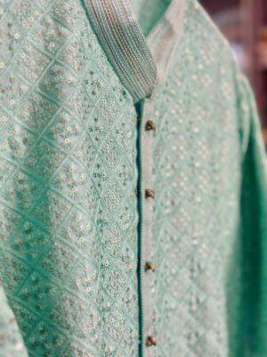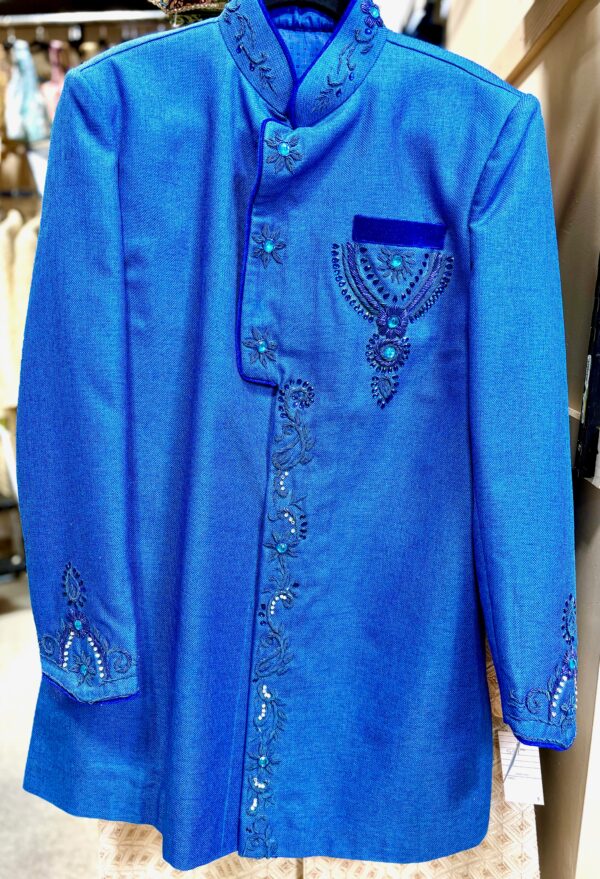 This sherwani jacket is ideal for weddings, receptions, or festive occasions — combining traditional Indian craftsmanship with contemporary color tones, perfect for someone wanting a bold yet sophisticated ethnic look.