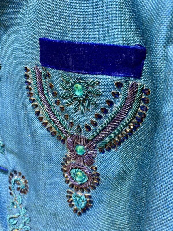 The chest pocket is accentuated with a deep velvet trim and a decorative embroidered motif just below it, adorned with shimmering stones and threadwork that enhance the royal aesthetic. The fabric itself has a soft sheen, giving the outfit a luxurious, polished look.