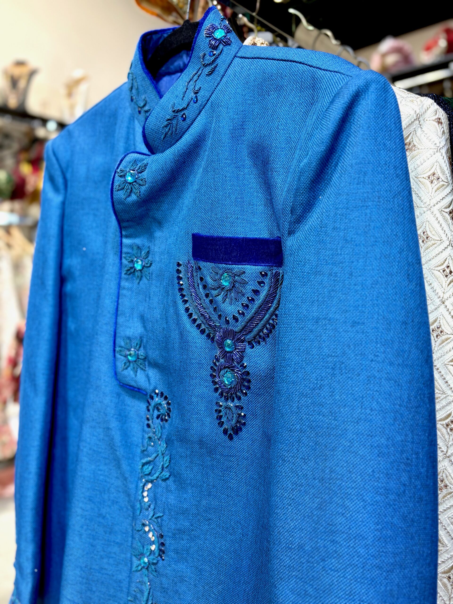 This is a striking royal blue sherwani-style jacket with elegant embroidery and embellishments. The jacket features a mandarin (bandhgala) collar intricately embroidered with floral and vine motifs in shades of navy blue and turquoise, highlighted with sequins and beadwork. The same rich embroidery runs vertically along the front placket and cuffs, adding a refined touch of sparkle and texture.