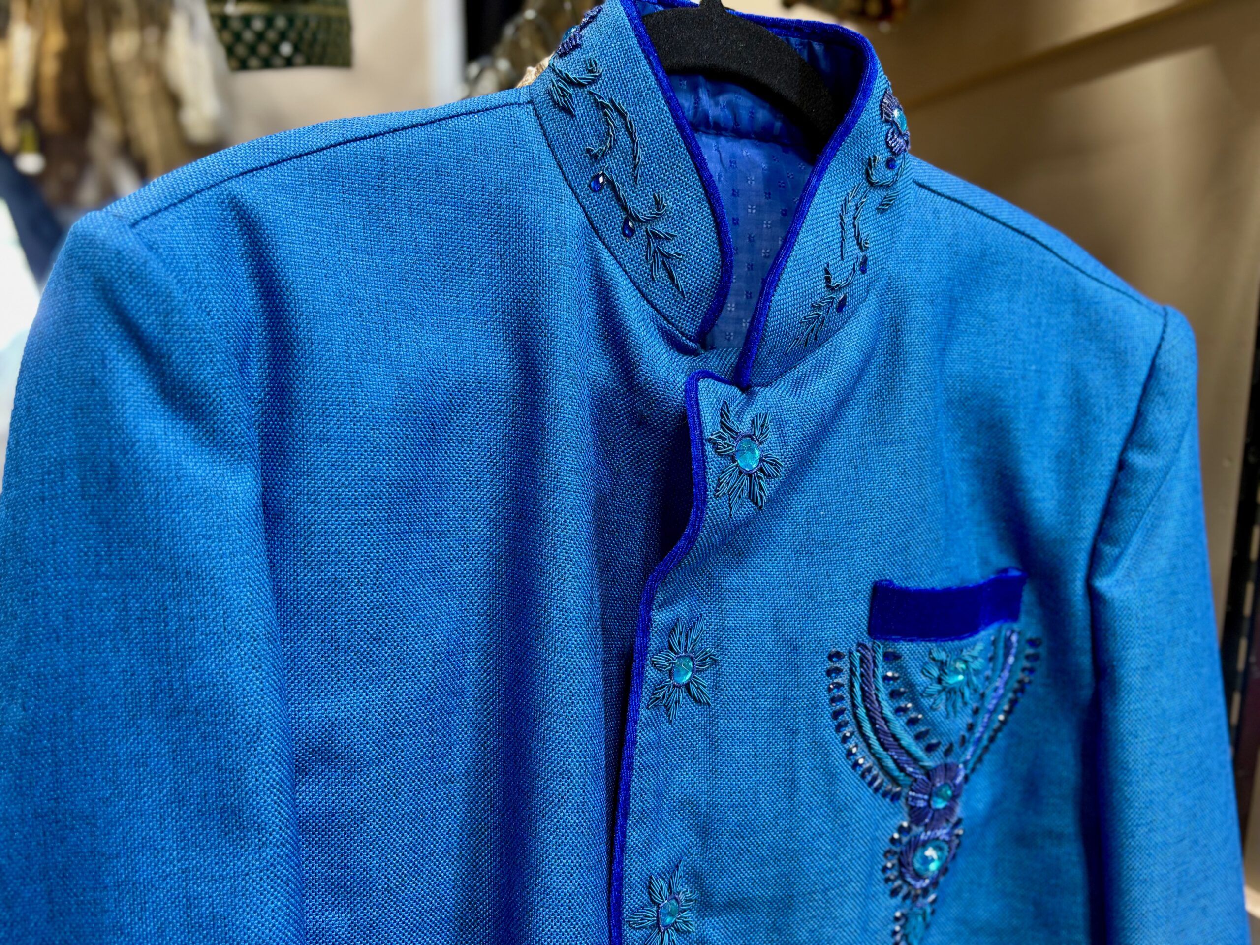 This sherwani jacket is ideal for weddings, receptions, or festive occasions — combining traditional Indian craftsmanship with contemporary color tones, perfect for someone wanting a bold yet sophisticated ethnic look.