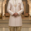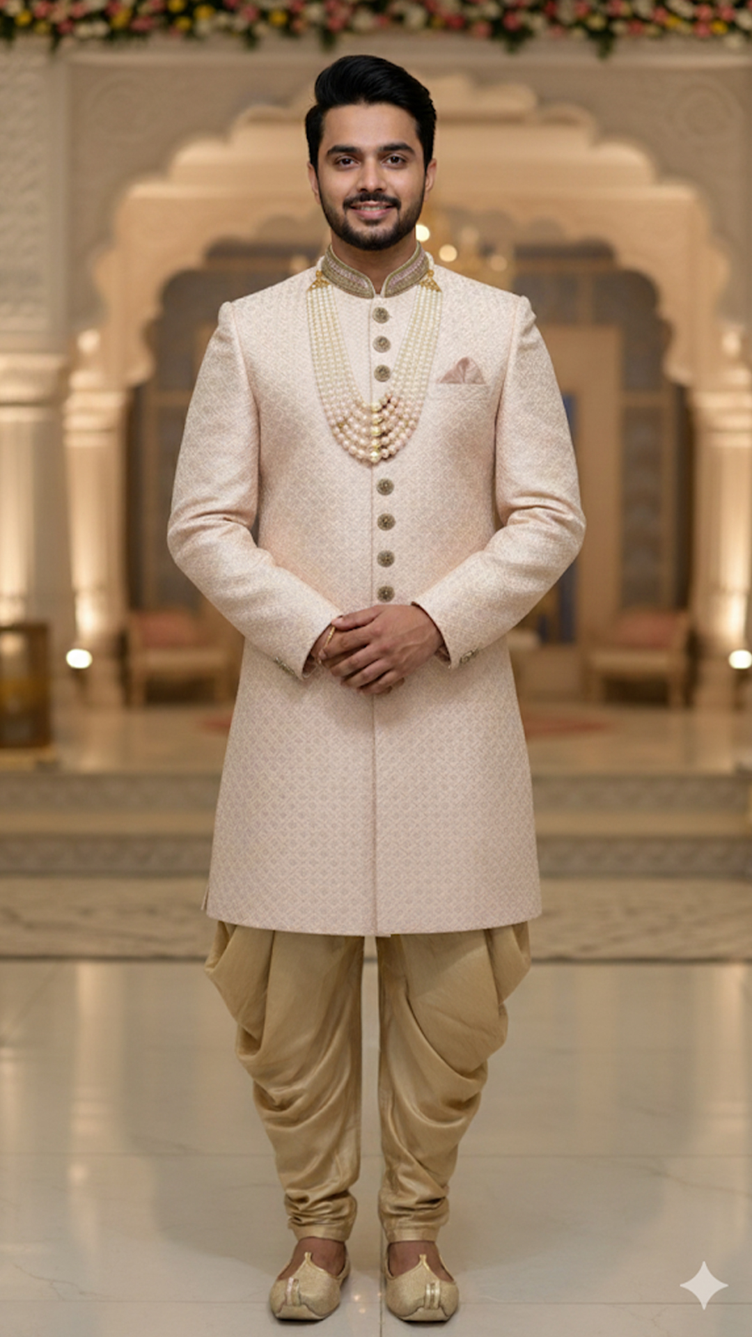 This beautiful Sherwani, handcrafted in Nagpur, India, exclusively for Pradon Silks, features meticulous workmanship, making it perfect for the groom or anyone seeking luxury. It includes a dusty peach top and gold dhoti pants, and as a bonus, a men’s necklace is included. Comparable items sell for more than double our price.