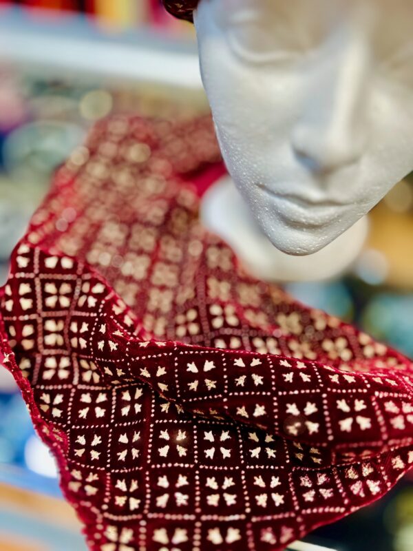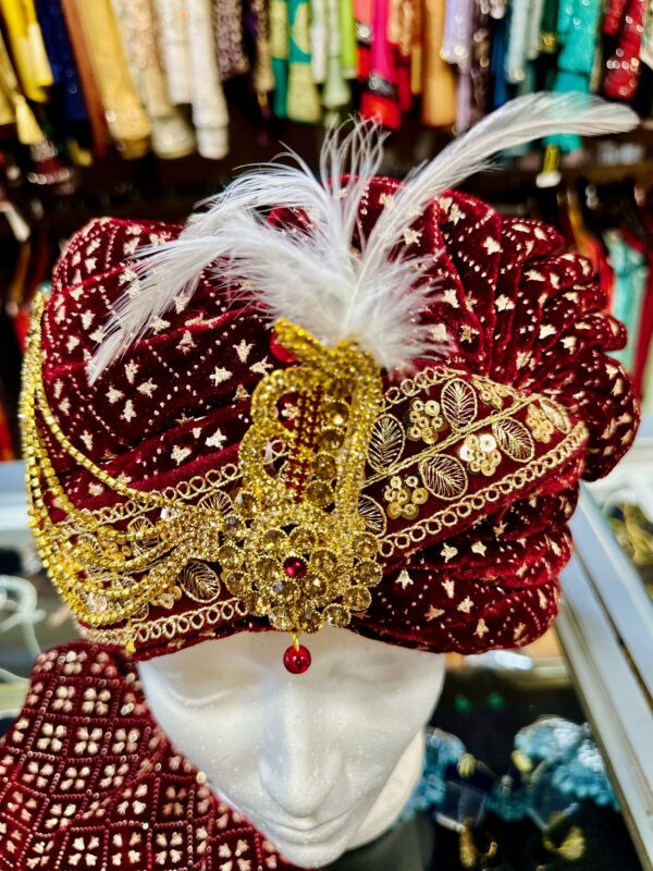 Luxurious Maroon Velvet Groom Turban adorned with intricate golden embroidery and stone embellishments.
