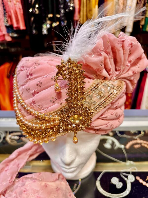 This is a beautifully crafted pastel pink groom’s turban, traditionally known as a safa or pagdi.