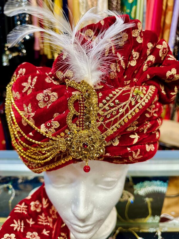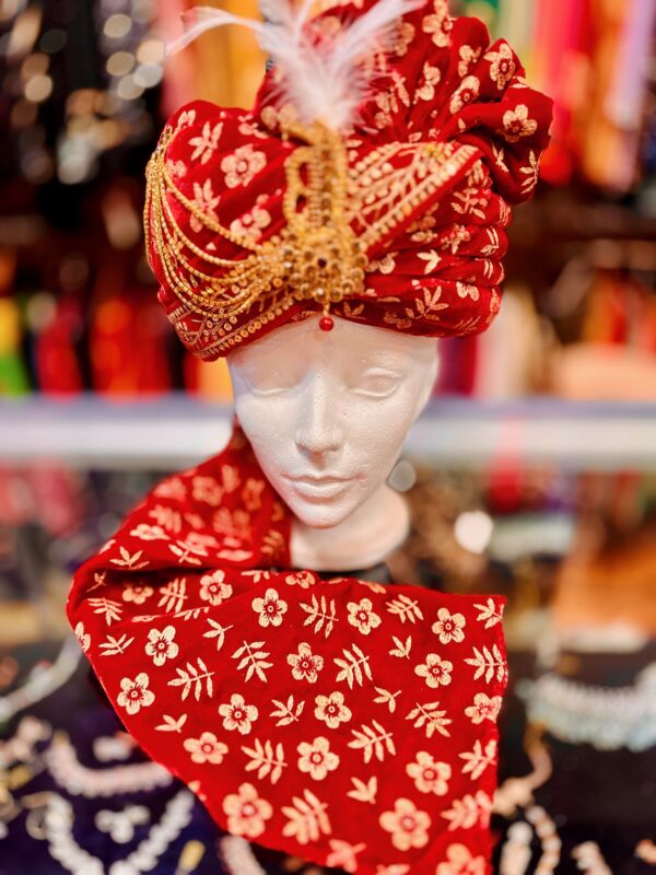 •The turban features gold beaded detailing and chains across the front, giving it a royal, statement look.