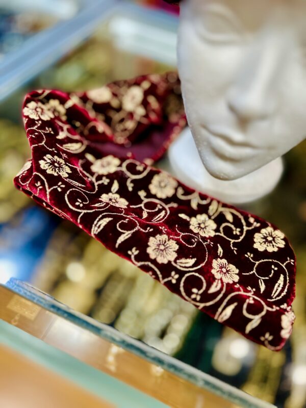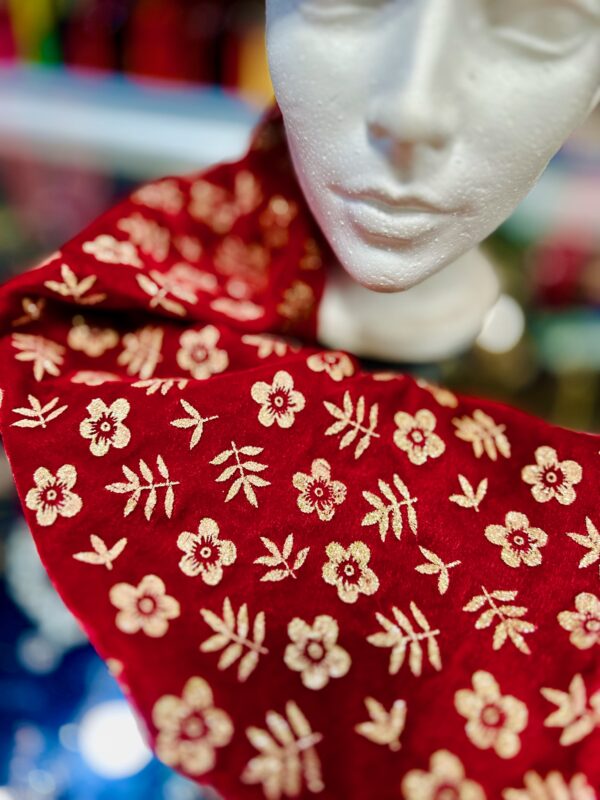 Made from rich red velvet fabric, adorned with gold floral embroidery all over, creating an elegant and festive appearance.