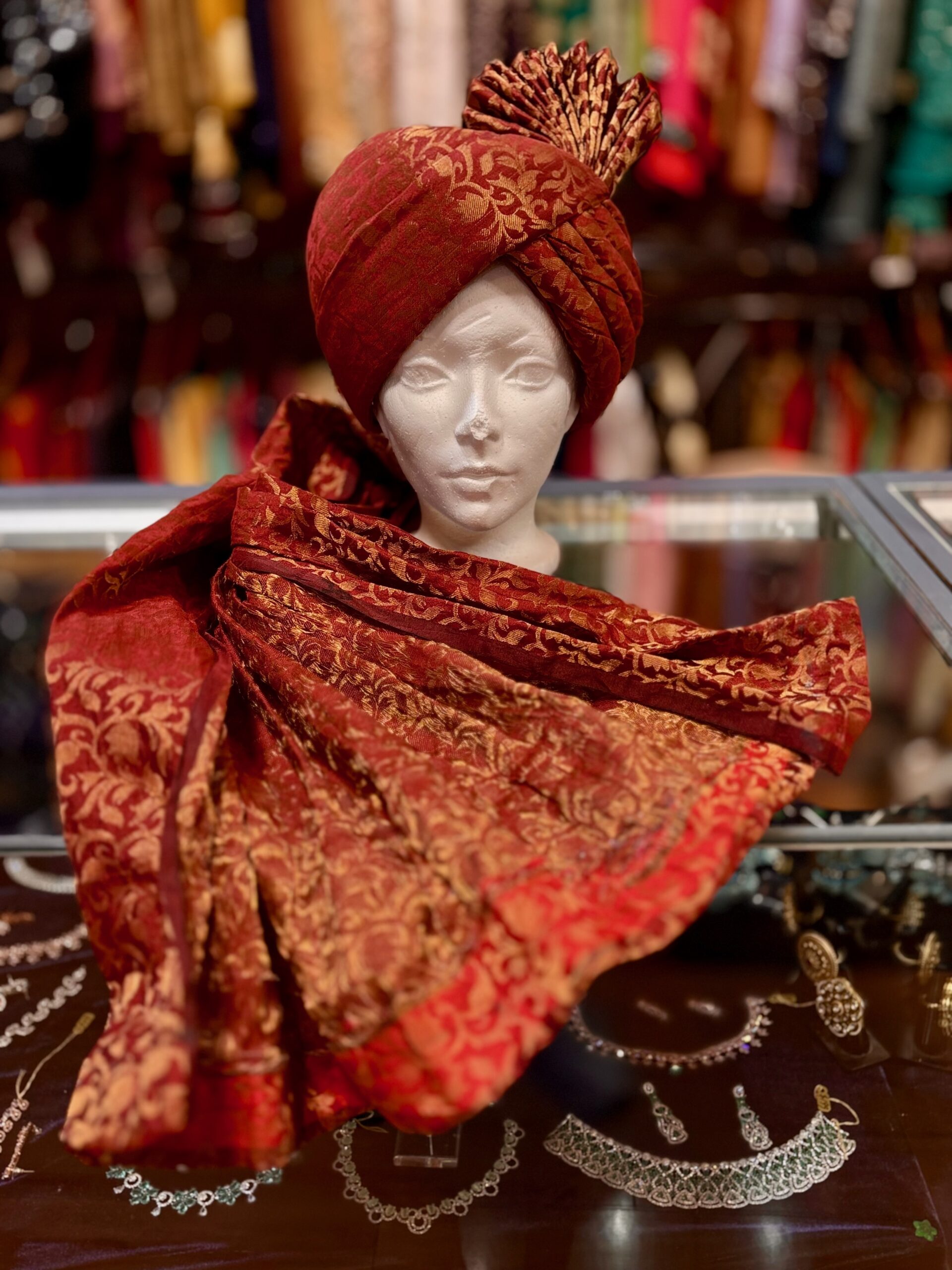 Exquisite bridal red silk turban featuring rich gold embroidery for a royal and traditional look.