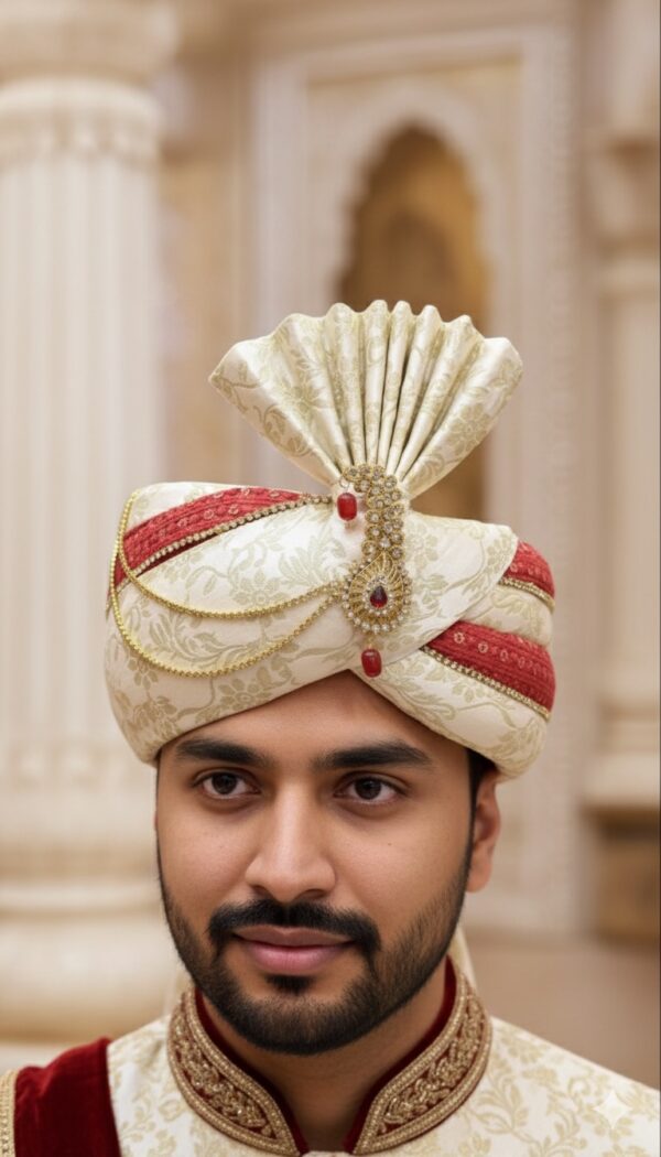 & Maroon Groom Safa pairs a classic ivory base with a richly textured