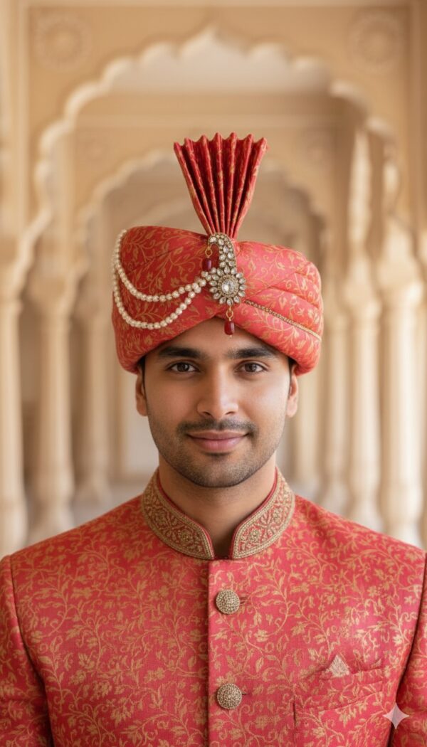 Crimson & Gold Groom’s Turban. Expertly crafted for the discerning groom,