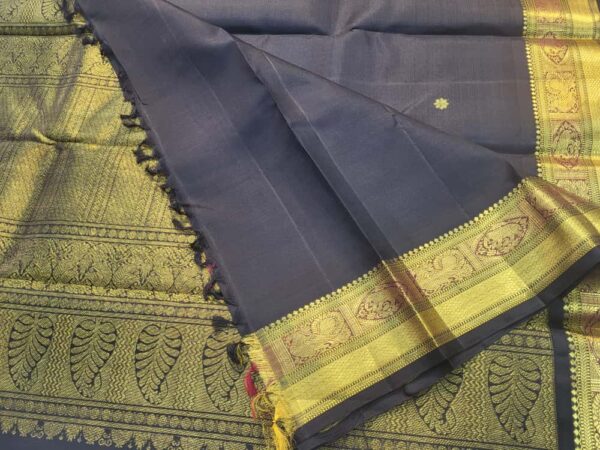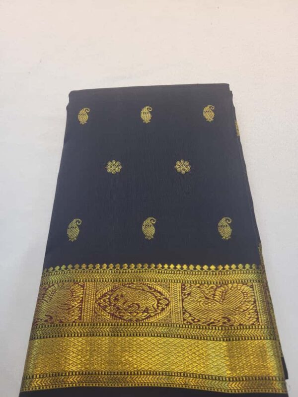 This stunning black Kanjeevaram saree is a timeless piece crafted from premium silk, known for its luxurious texture and durability. The deep black body is beautifully contrasted with intricate gold zari work along the borders and pallu, featuring traditional South Indian motifs like peacocks, paisleys, and floral vines. Handwoven in the heart of Tamil Nadu, this saree reflects the heritage of Kanjeevaram craftsmanship. Ideal for grand celebrations, weddings, or festive occasions, it pairs gracefully with traditional gold jewelry to complete a regal look.