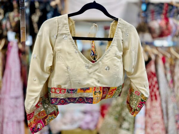 This graceful beige silk blouse exudes understated sophistication with its subtle embroidered motifs and rich patchwork border design. The deep neckline with tie-up tassels at the back adds a traditional charm, while the colorful patch detailing on the sleeves and waistline brings a vibrant ethnic touch. Perfect for pairing with sarees or lehengas, this blouse beautifully balances simplicity and elegance — ideal for festive occasions, cultural events, or wedding celebrations.