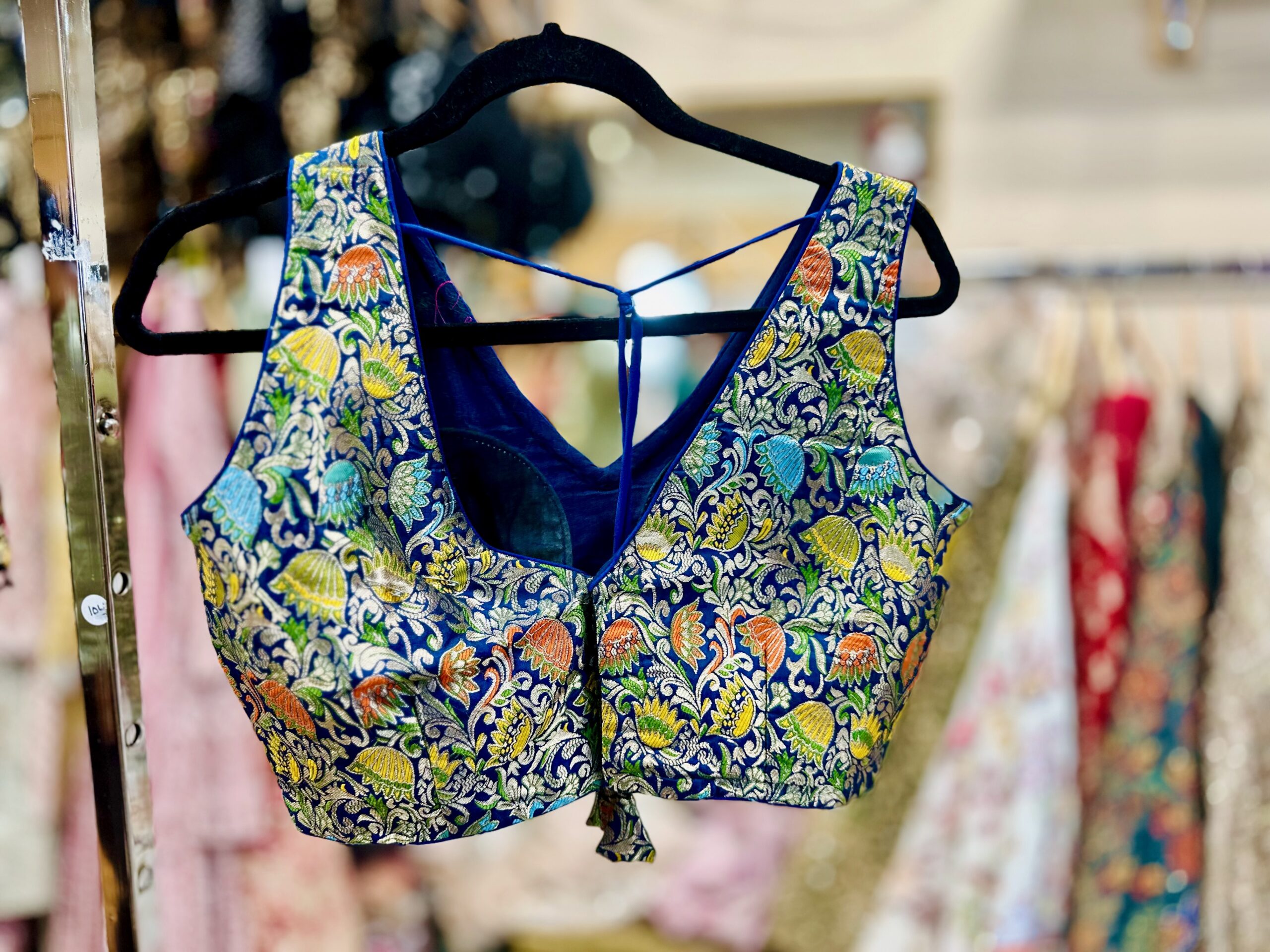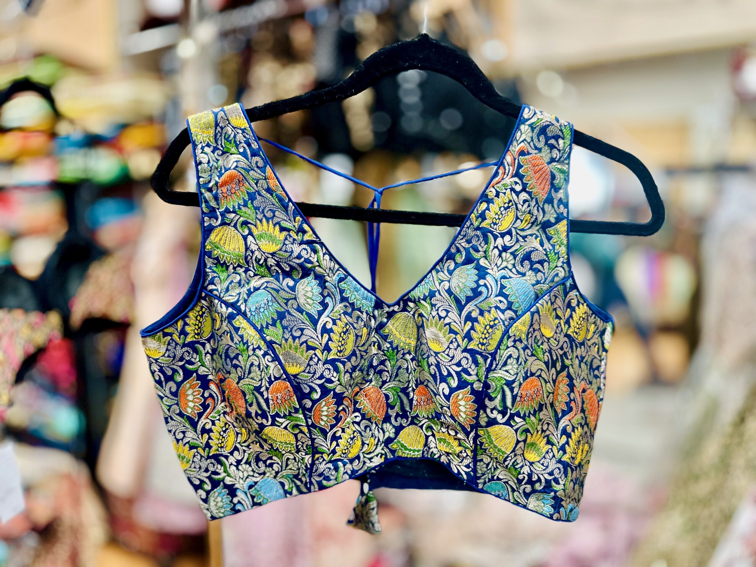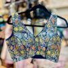 Blue brocade blouse with multicoloured floral print