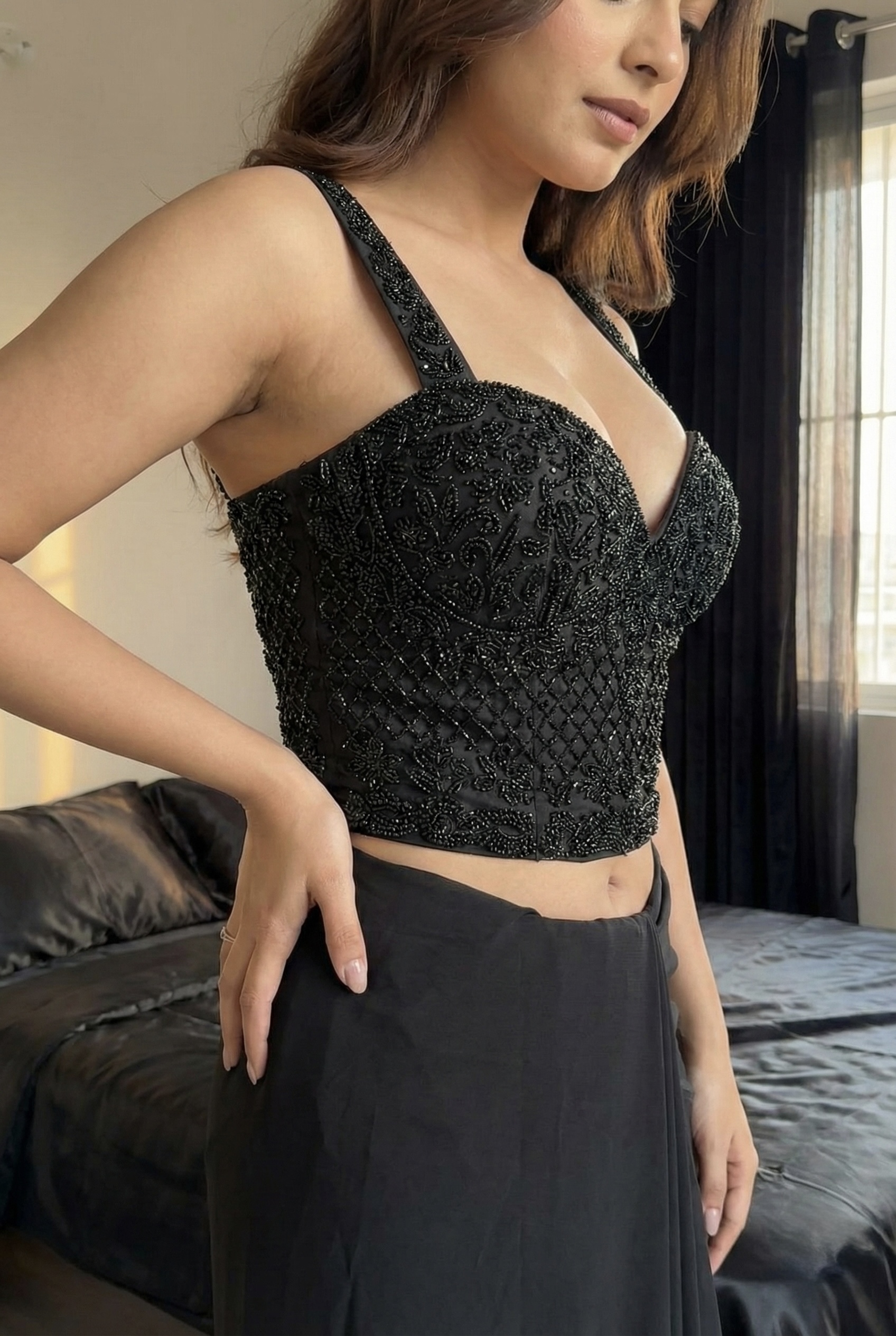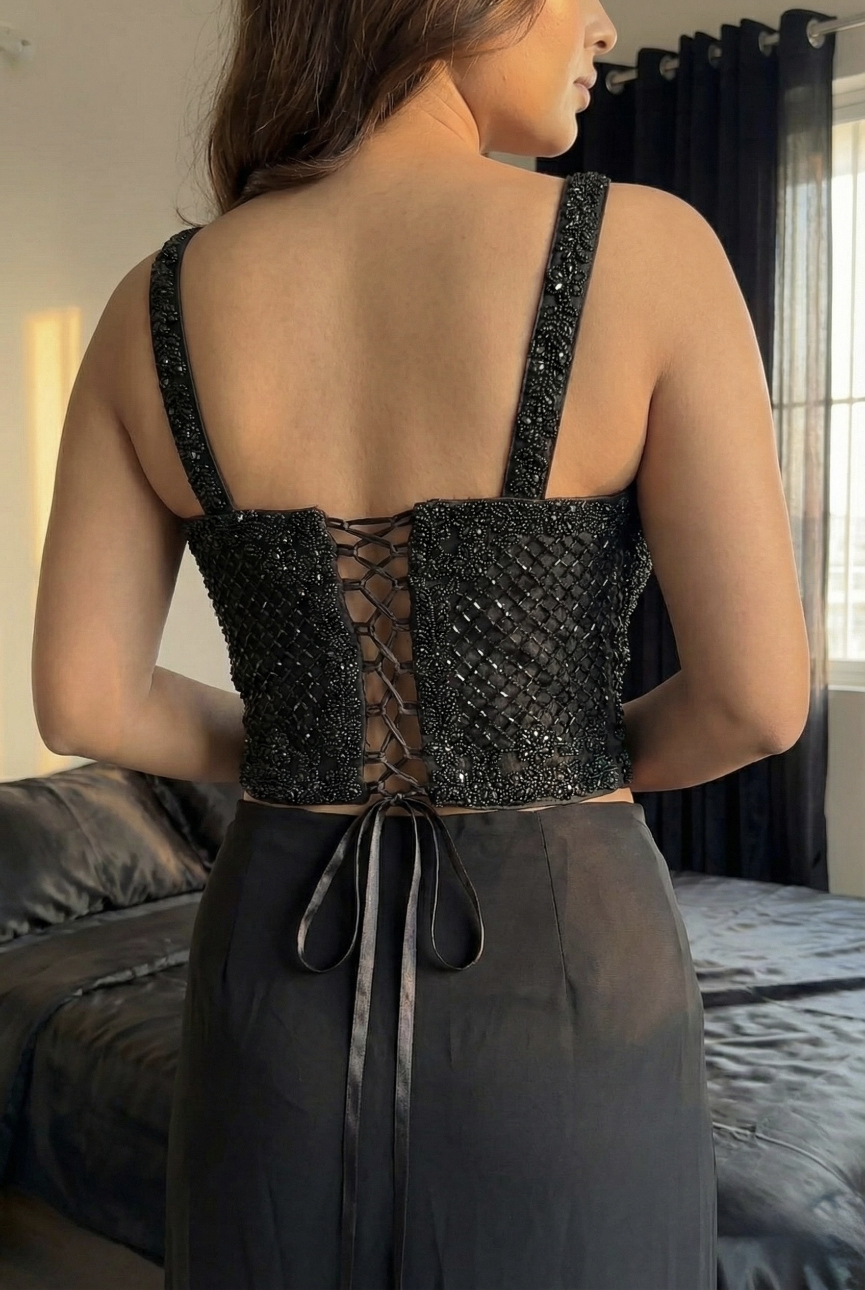 Turn every entry into a red‑carpet moment with this jet‑black beaded corset blouse, designed to sculpt your curves and elevate any saree or skirt look. The dramatic structured bust and sleek lace‑up back add a bold, modern edge while keeping the fit fully adjustable for all‑night comfort.
