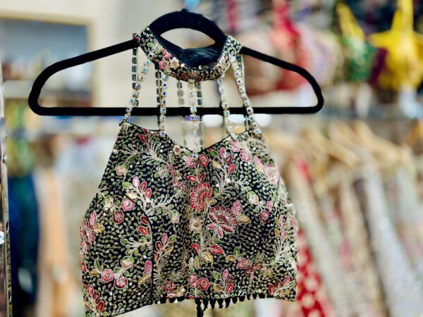 Make a statement with this stunning black halter-neck blouse, beautifully adorned with intricate multicolour floral embroidery and shimmering sequin detailing. The blouse features an elegant cage-style neckline embellished with delicate stone and bead accents, adding a modern twist to traditional charm. Perfect for pairing with sarees or lehengas, this designer piece exudes festive glamour and sophistication — ideal for weddings, receptions, and celebratory occasions.