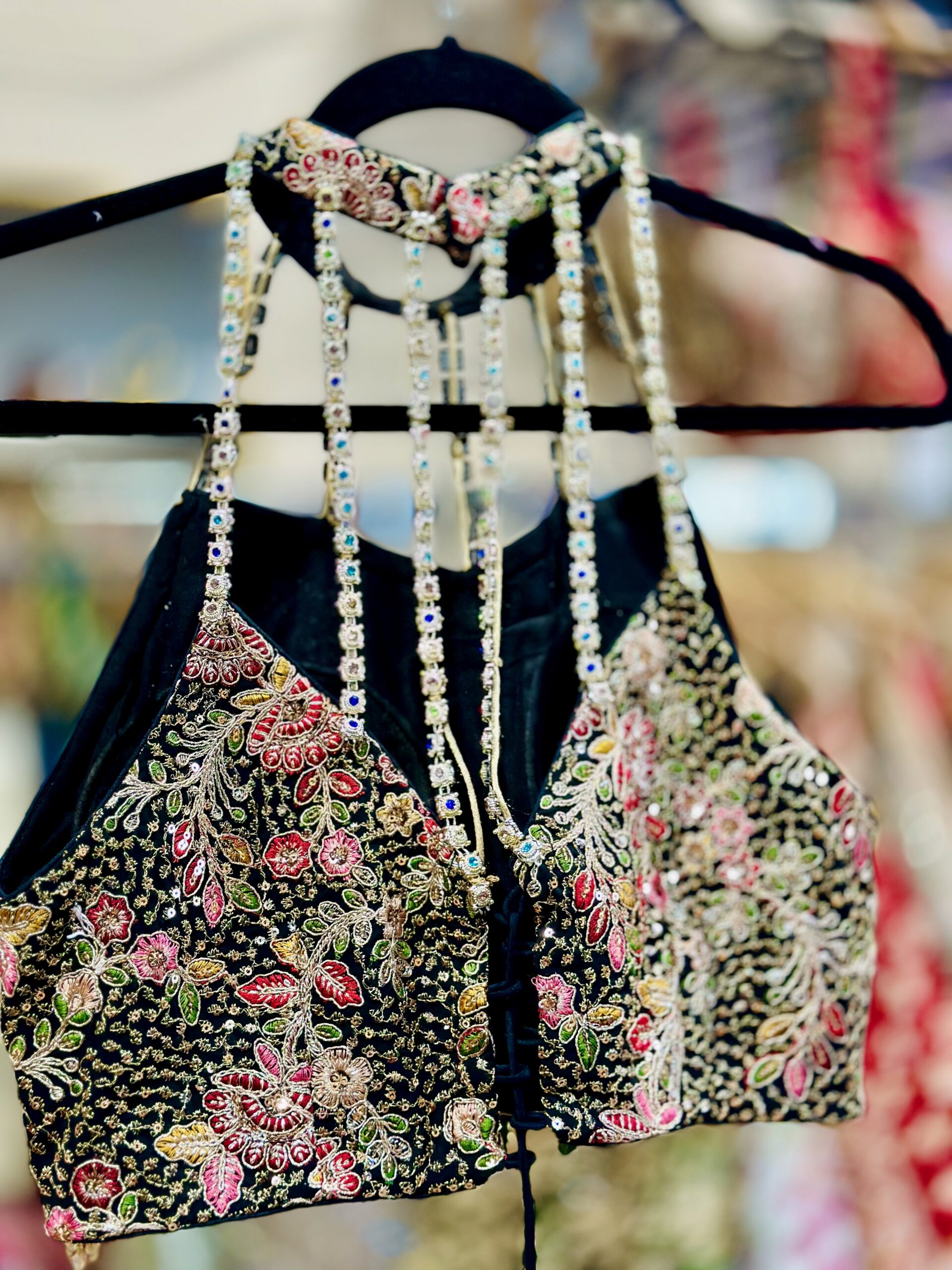 Make a statement with this stunning black halter-neck blouse, beautifully adorned with intricate multicolour floral embroidery and shimmering sequin detailing. The blouse features an elegant cage-style neckline embellished with delicate stone and bead accents, adding a modern twist to traditional charm. Perfect for pairing with sarees or lehengas, this designer piece exudes festive glamour and sophistication — ideal for weddings, receptions, and celebratory occasions.
