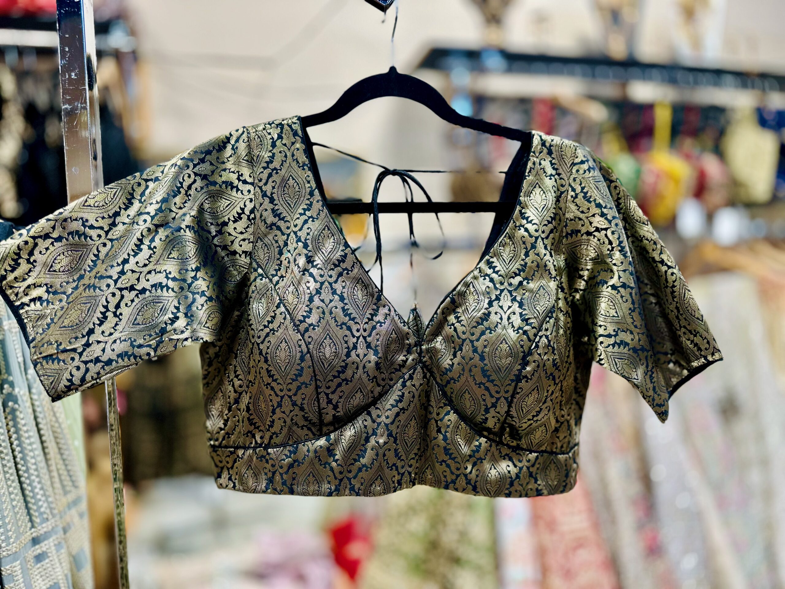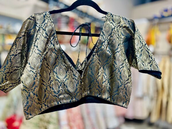This graceful beige silk blouse exudes understated sophistication with its subtle embroidered motifs and rich patchwork border design. The deep neckline with tie-up tassels at the back adds a traditional charm, while the colorful patch detailing on the sleeves and waistline brings a vibrant ethnic touch. Perfect for pairing with sarees or lehengas, this blouse beautifully balances simplicity and elegance — ideal for festive occasions, cultural events, or wedding celebrations.