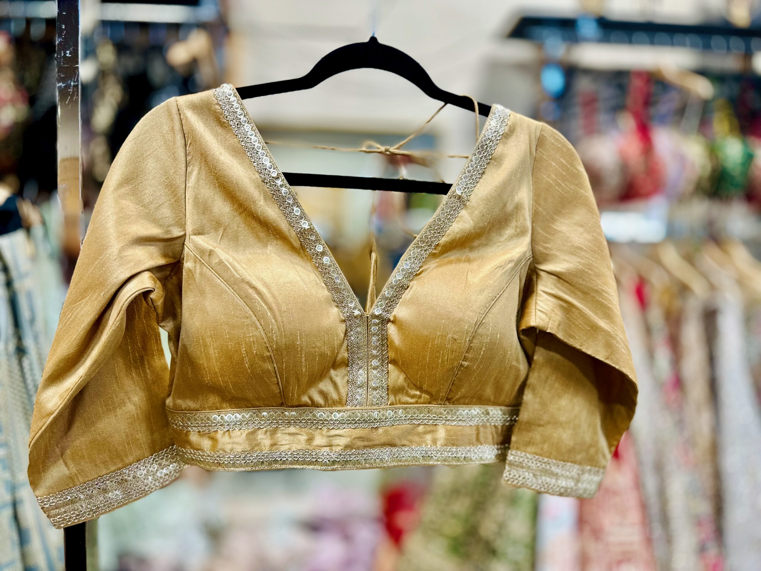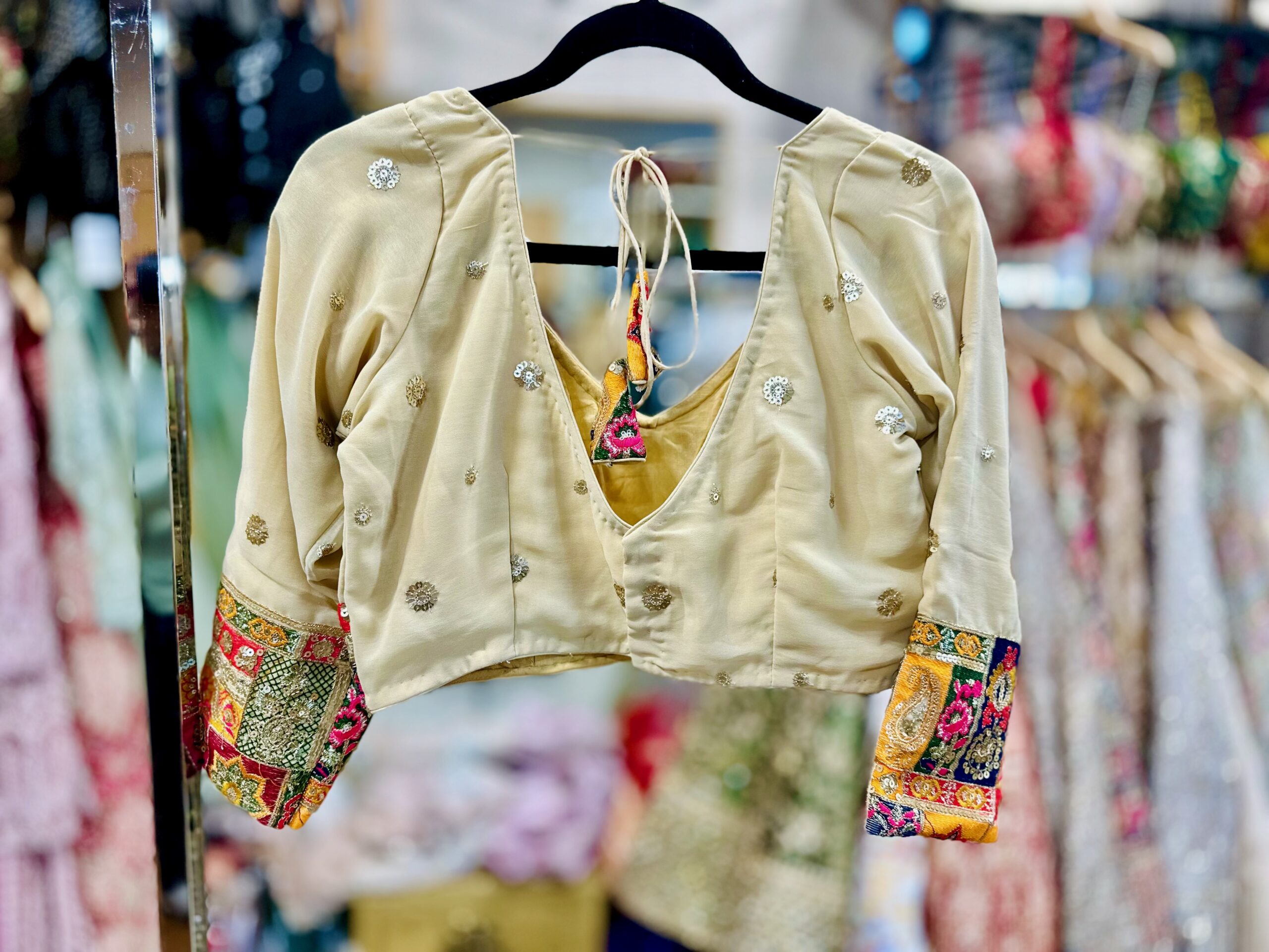 This graceful beige silk blouse exudes understated sophistication with its subtle embroidered motifs and rich patchwork border design. The deep neckline with tie-up tassels at the back adds a traditional charm, while the colorful patch detailing on the sleeves and waistline brings a vibrant ethnic touch. Perfect for pairing with sarees or lehengas, this blouse beautifully balances simplicity and elegance — ideal for festive occasions, cultural events, or wedding celebrations.