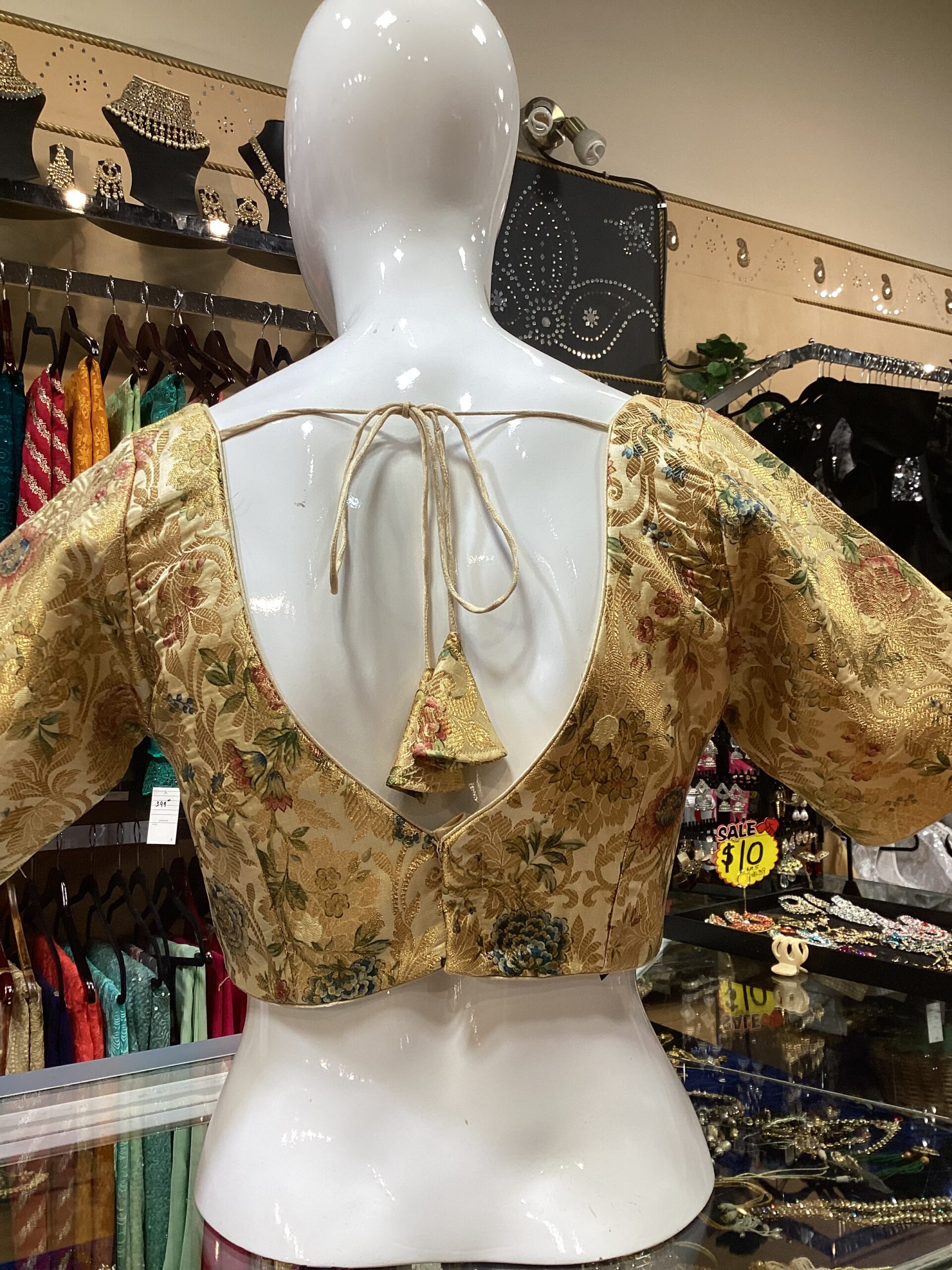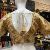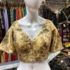 This elegant golden brocade blouse features a rich floral weave with intricate multicolored motifs in shades of blue, red, and green, exuding a regal charm. Designed with a deep V-neckline and short flared sleeves, it beautifully blends traditional craftsmanship with a modern silhouette. The glossy texture and detailed woven patterns give it a luxurious appeal, while the front zipper closure ensures a perfect fit. Ideal for pairing with sarees or lehengas, this versatile blouse adds a touch of sophistication and festive glamour to any ethnic ensemble.