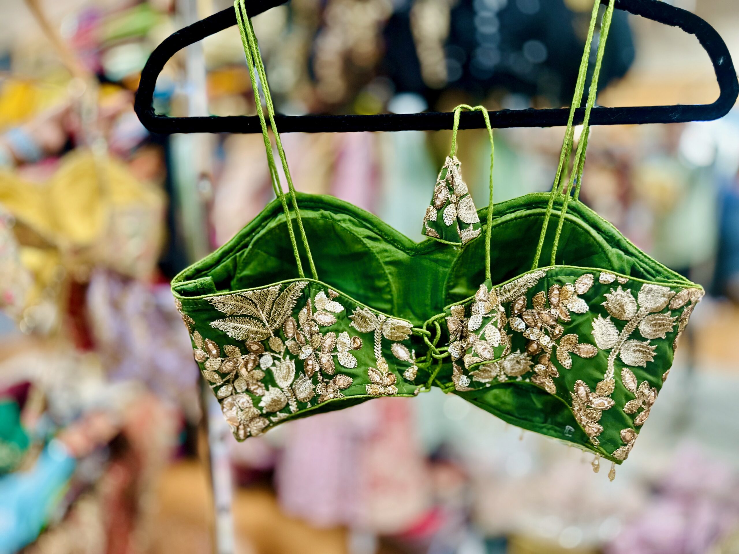 high end noodle strap blouse with golden embroidery