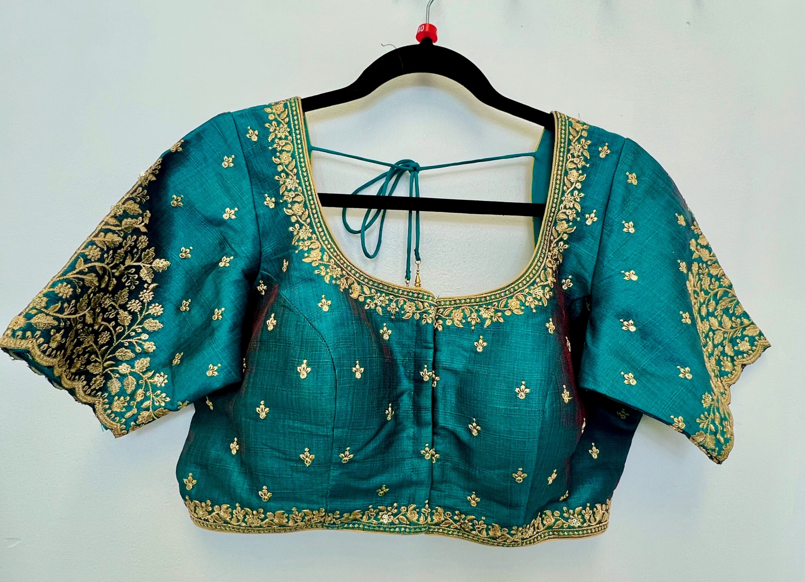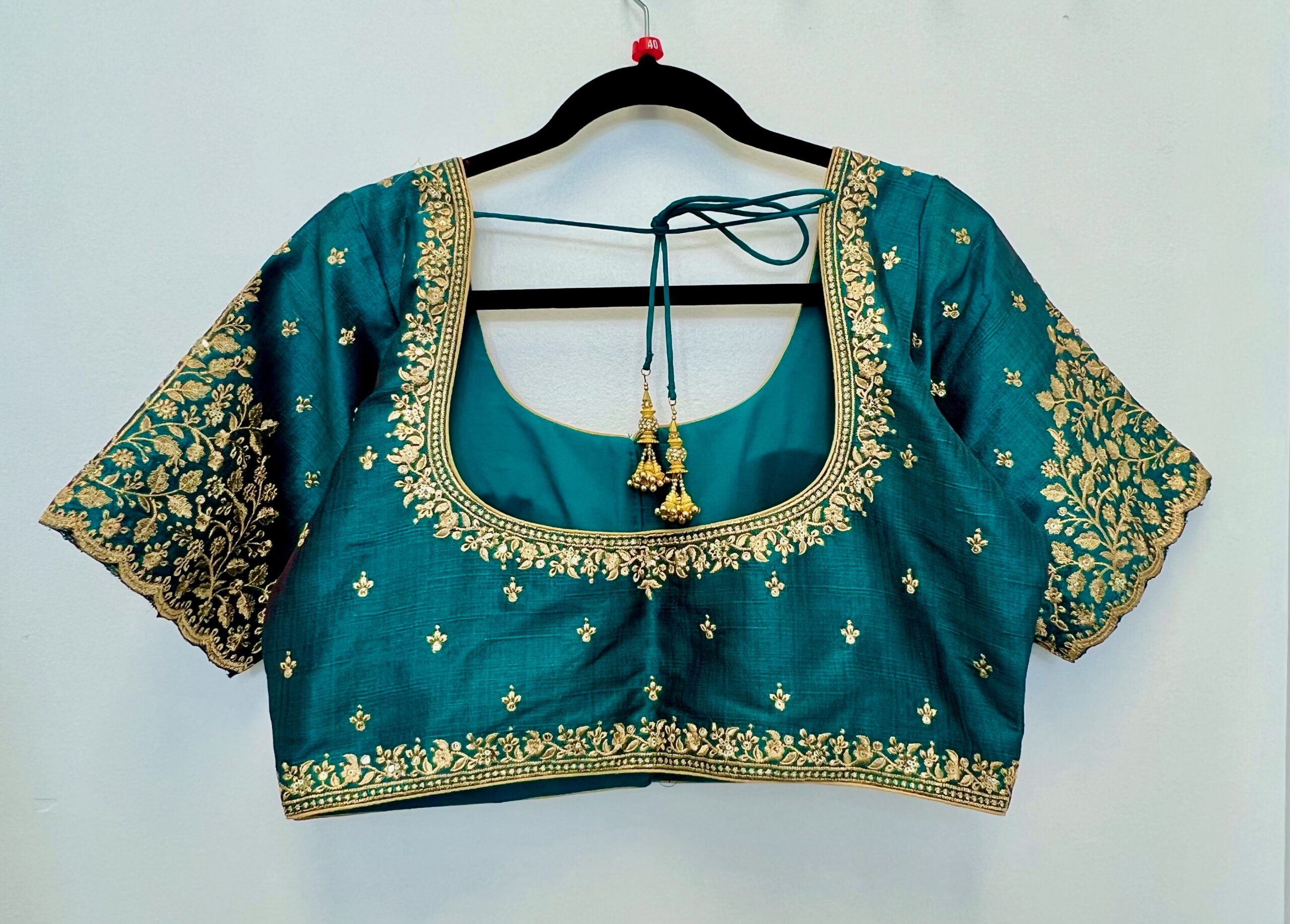 Timeless and graceful, this Rama green blouse features intricate embroidery that adds elegance and charm to any traditional look. Made in size 40, it can be expanded up to 3 sizes, offering a comfortable and adjustable fit. Perfect for pairing with sarees or lehengas, this blouse is a versatile addition to your festive wardrobe.