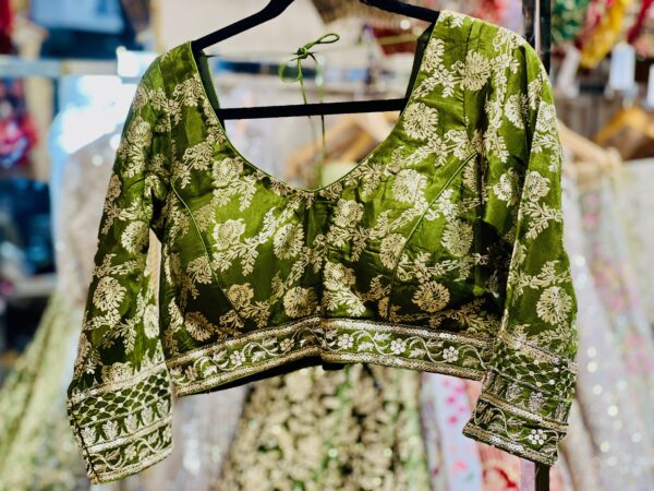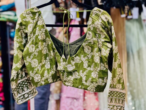 This graceful beige silk blouse exudes understated sophistication with its subtle embroidered motifs and rich patchwork border design. The deep neckline with tie-up tassels at the back adds a traditional charm, while the colorful patch detailing on the sleeves and waistline brings a vibrant ethnic touch. Perfect for pairing with sarees or lehengas, this blouse beautifully balances simplicity and elegance — ideal for festive occasions, cultural events, or wedding celebrations.