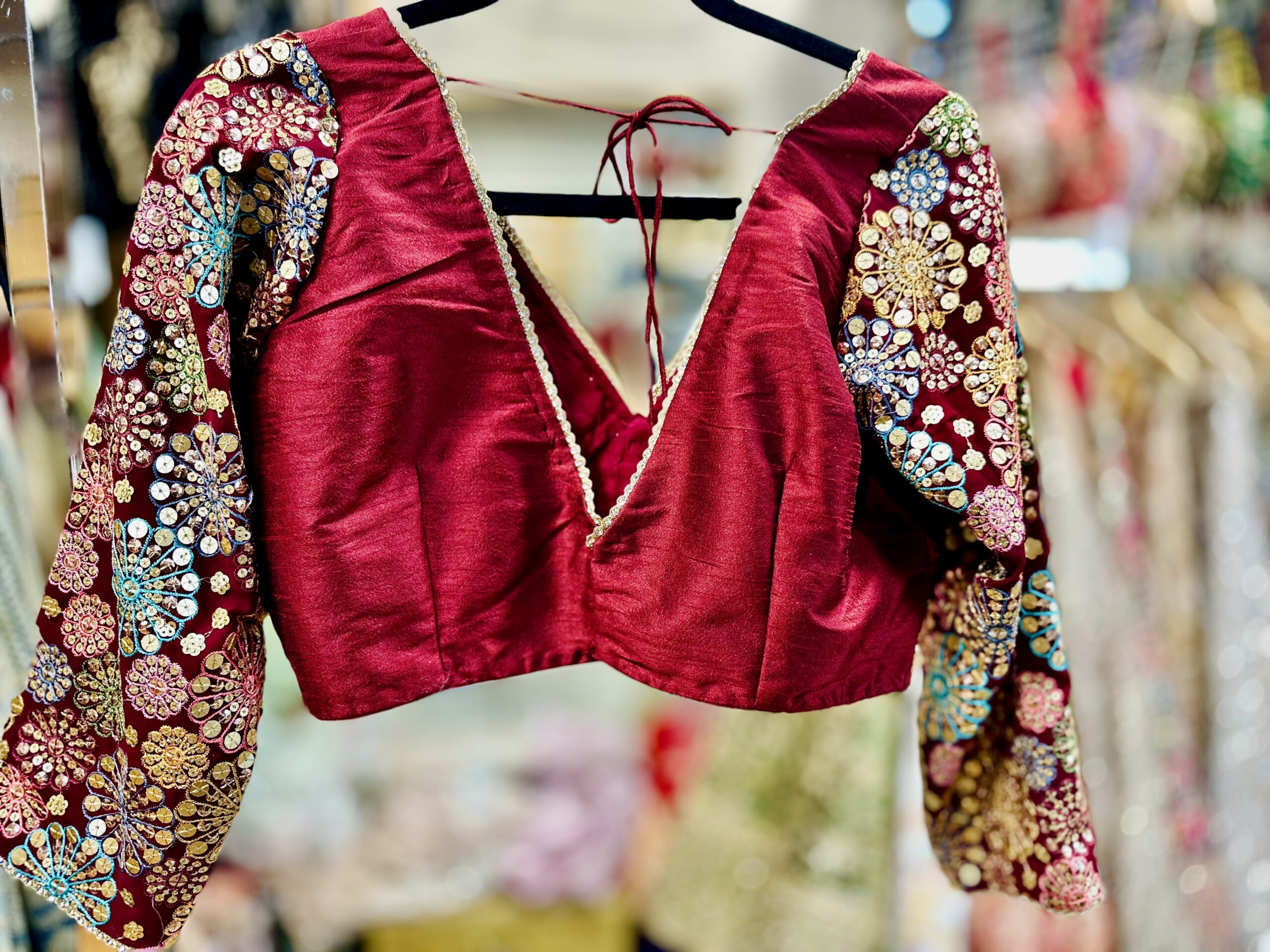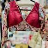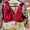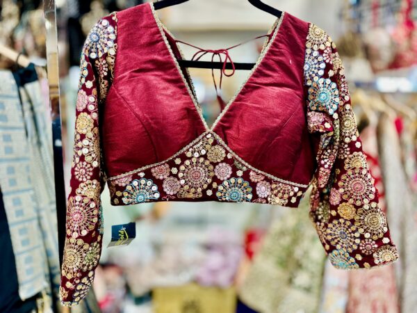 This is a maroon, long-sleeved blouse with a deep V-neckline. The garment is heavily embellished with intricate gold and multicolored embroidery, featuring floral patterns on the sleeves and a geometric chevron design on the lower half.It appears to be a choli-style top, commonly worn with saree or lehenga.