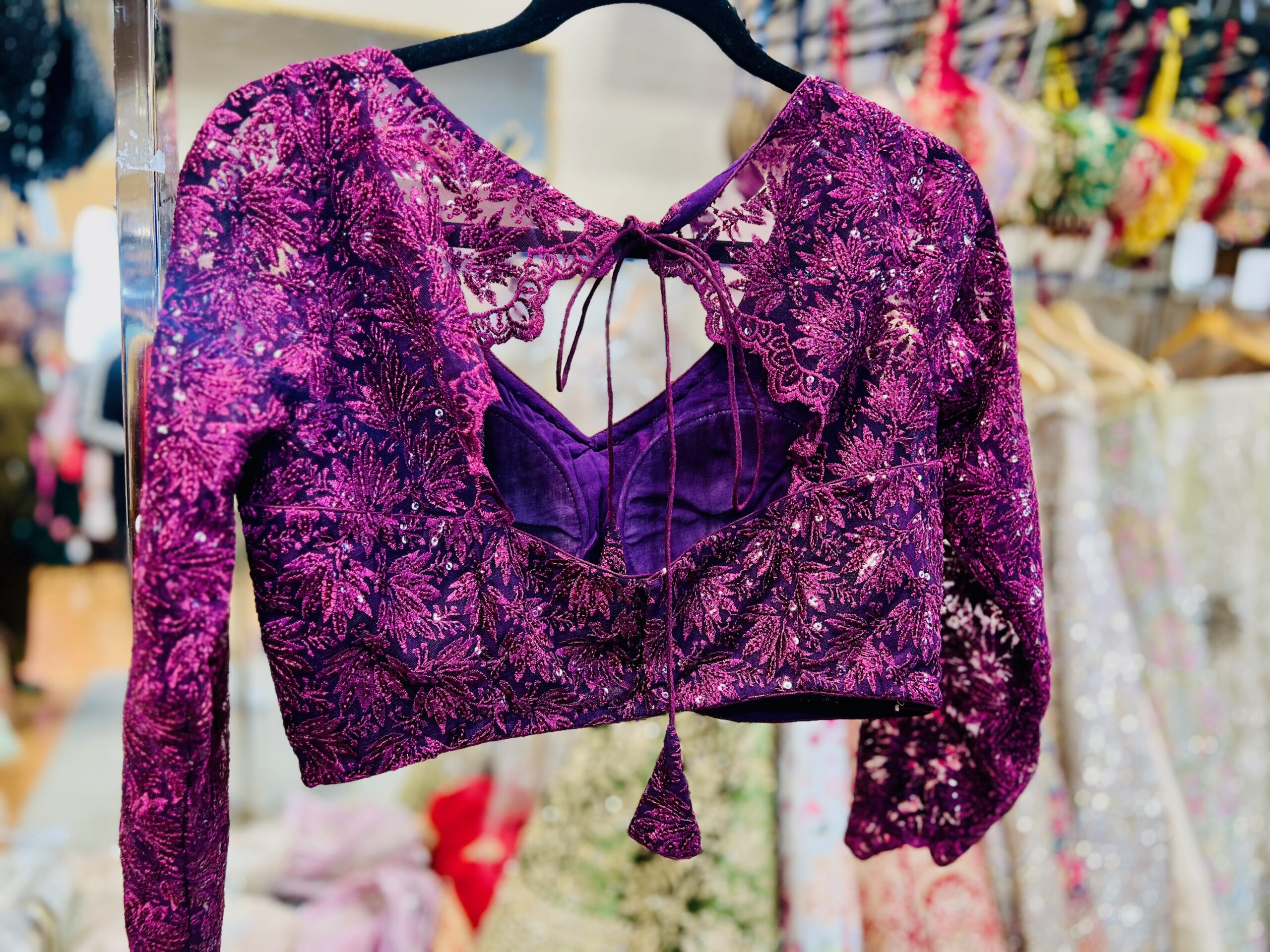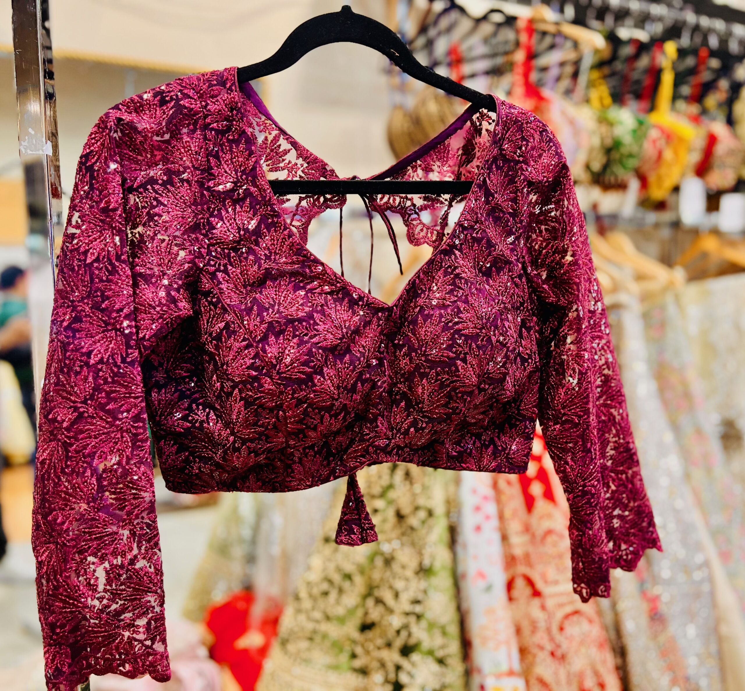 Stylish maroon net blouse with thread work and little glitter sequins .