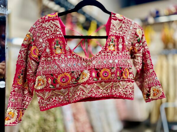 This elegant maroon blouse showcases rich traditional craftsmanship with intricate mirror work, zari embroidery, and vibrant multicolour thread detailing. The design features a deep U-neckline with a tie-up back and full sleeves, offering a perfect blend of comfort and festive charm. Ideal for pairing with lehengas or sarees, this blouse adds a royal touch to any ethnic outfit — perfect for weddings, festive celebrations, or cultural events.