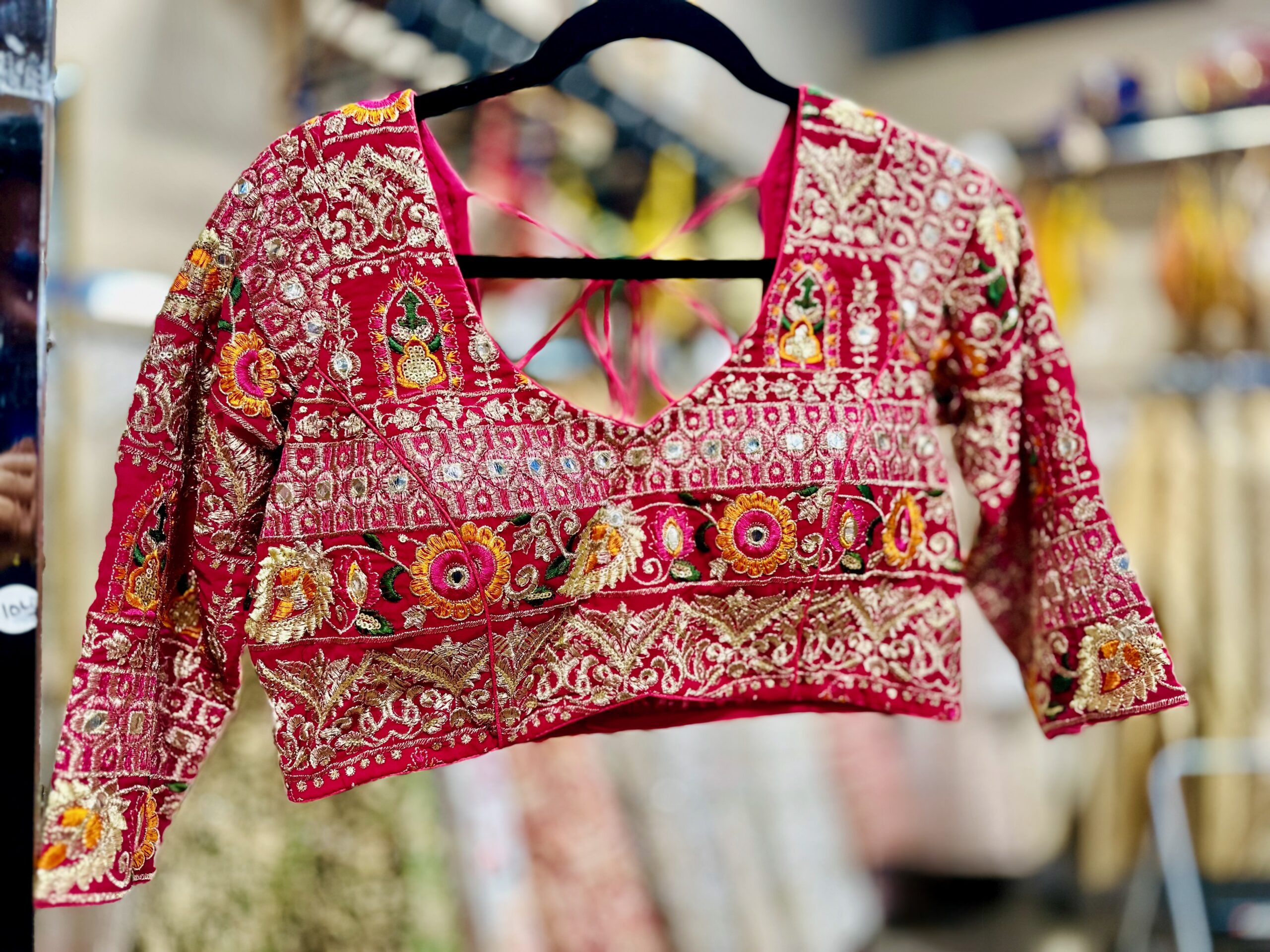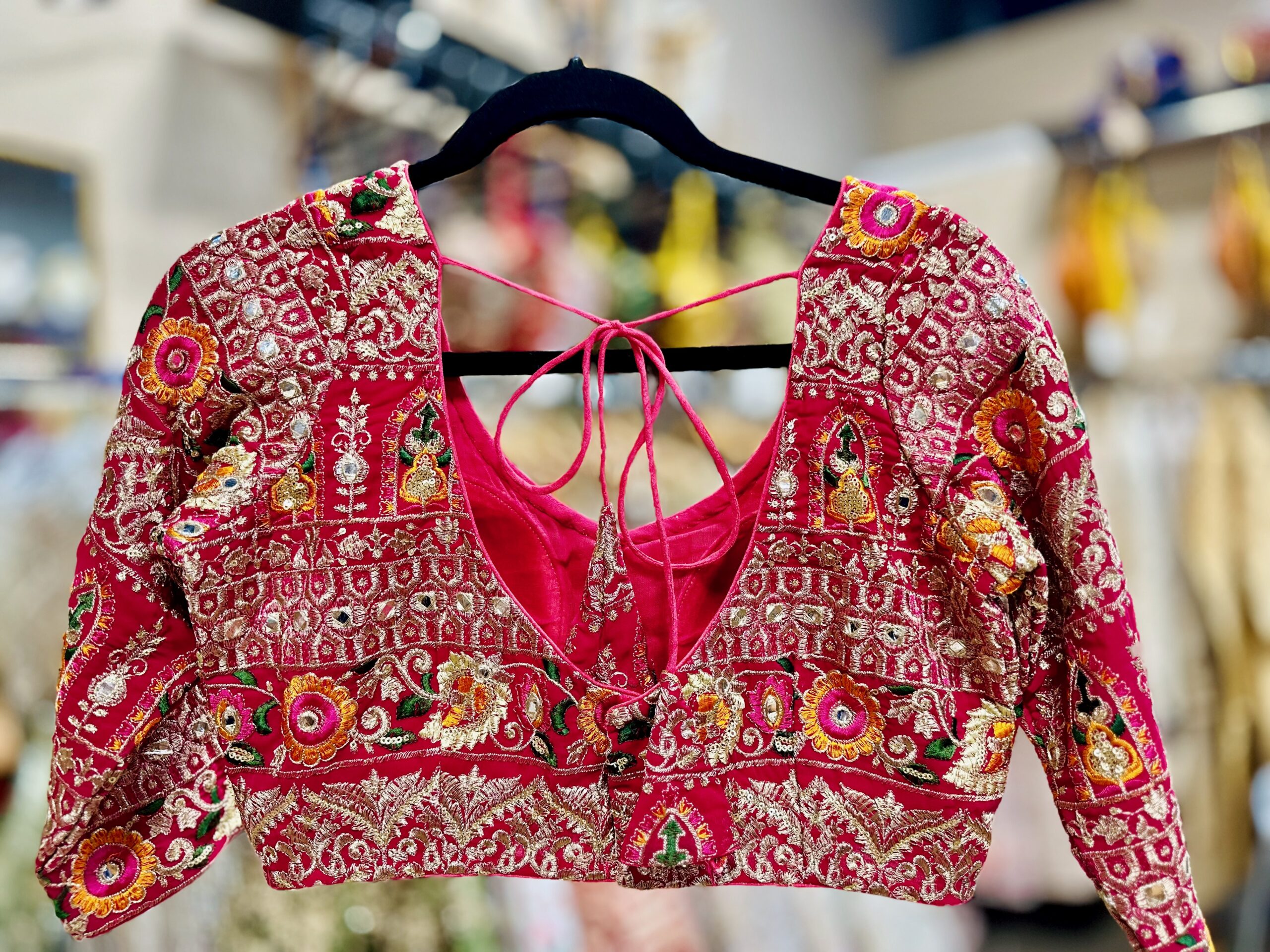 This elegant maroon blouse showcases rich traditional craftsmanship with intricate mirror work, zari embroidery, and vibrant multicolour thread detailing. The design features a deep U-neckline with a tie-up back and full sleeves, offering a perfect blend of comfort and festive charm. Ideal for pairing with lehengas or sarees, this blouse adds a royal touch to any ethnic outfit — perfect for weddings, festive celebrations, or cultural events.