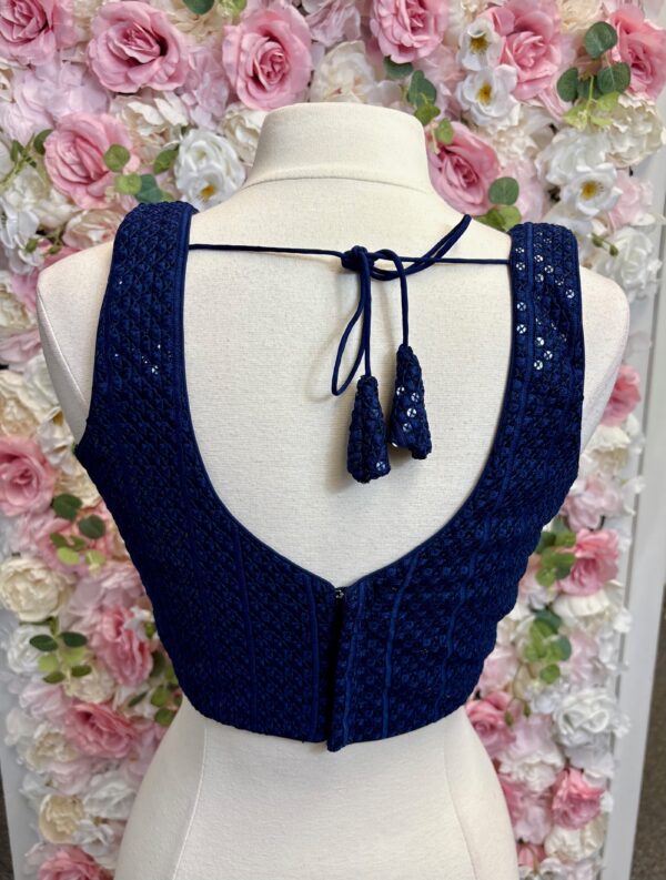Stylish and versatile, this navy blue blouse features elegant self-sequins that add a subtle shimmer to your ensemble. Designed in size 38, it can be opened up to 3 sizes for a comfortable, adjustable fit. The blouse comes with a back hook closure for a secure finish and includes optional short sleeves that can be attached as desired—perfect for both modern and traditional styling.