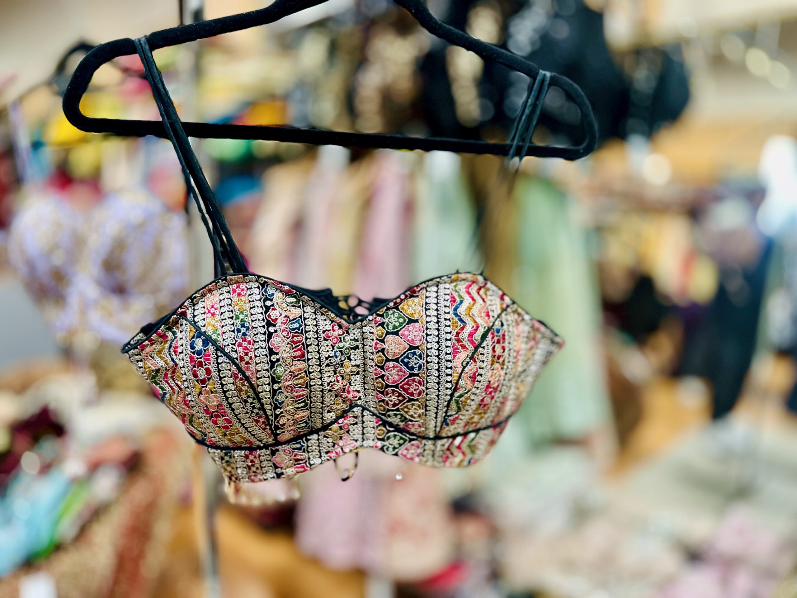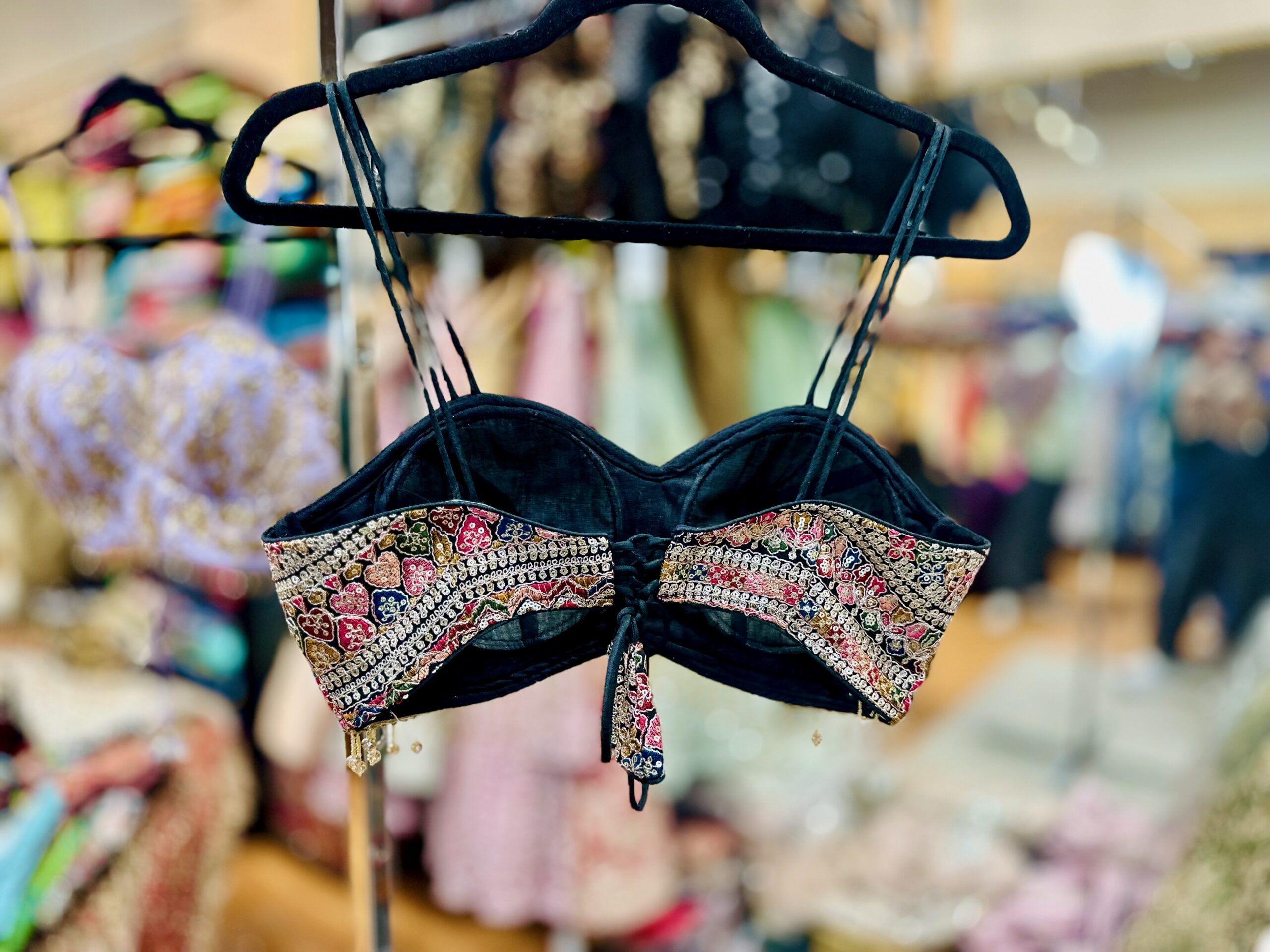 This stunning noodle strap blouse is designed with intricate multicolor embroidery highlighted by sequins, giving it a rich and festive appeal. The structured bust and fitted silhouette provide a modern touch, while the crystal bead drops along the hem add a playful and glamorous charm. The back features a stylish tie-up design for an adjustable fit. Perfect for weddings, receptions, or festive occasions, this versatile blouse pairs beautifully with lehengas, sarees, or skirts, making it a must-have statement piece in your ethnic wardrobe.