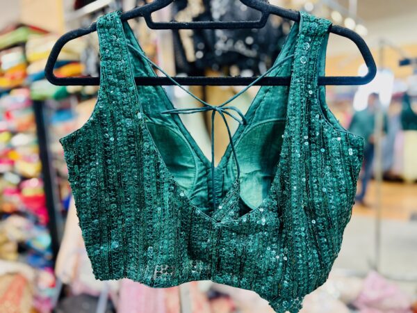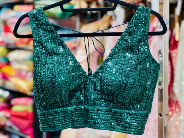 This stunning bottle green blouse dazzles with its all-over sequin embellishments that catch the light beautifully, creating a glamorous and elegant effect. The deep, rich green hue complements the sparkle, making it an ideal choice for pairing with sarees or lehengas. Expertly tailored for a flattering fit, the blouse features a stylish neckline and sleek design that enhance its modern appeal while maintaining a traditional touch. Perfect for weddings, parties, or festive celebrations, this sequin blouse brings effortless sophistication and shimmer to your ensemble