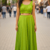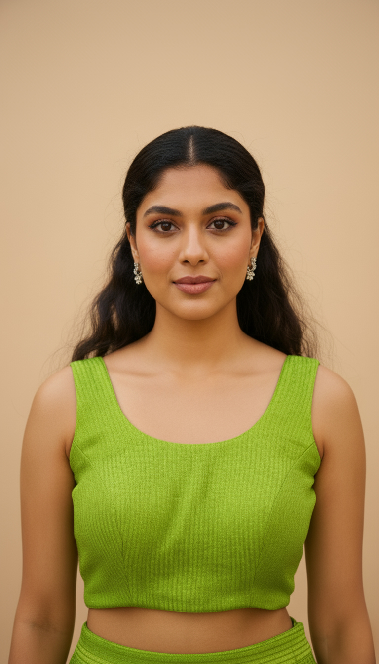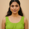 Parrot green is a trending colour in bollywood. this medium strap blouse is made of soft fabric and mini sequins, perfect fit and adjustable 2 sizes up or downÂ