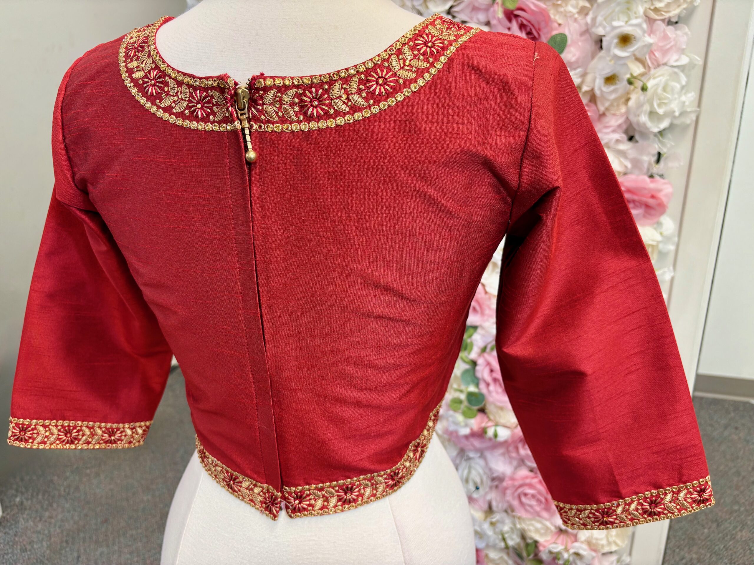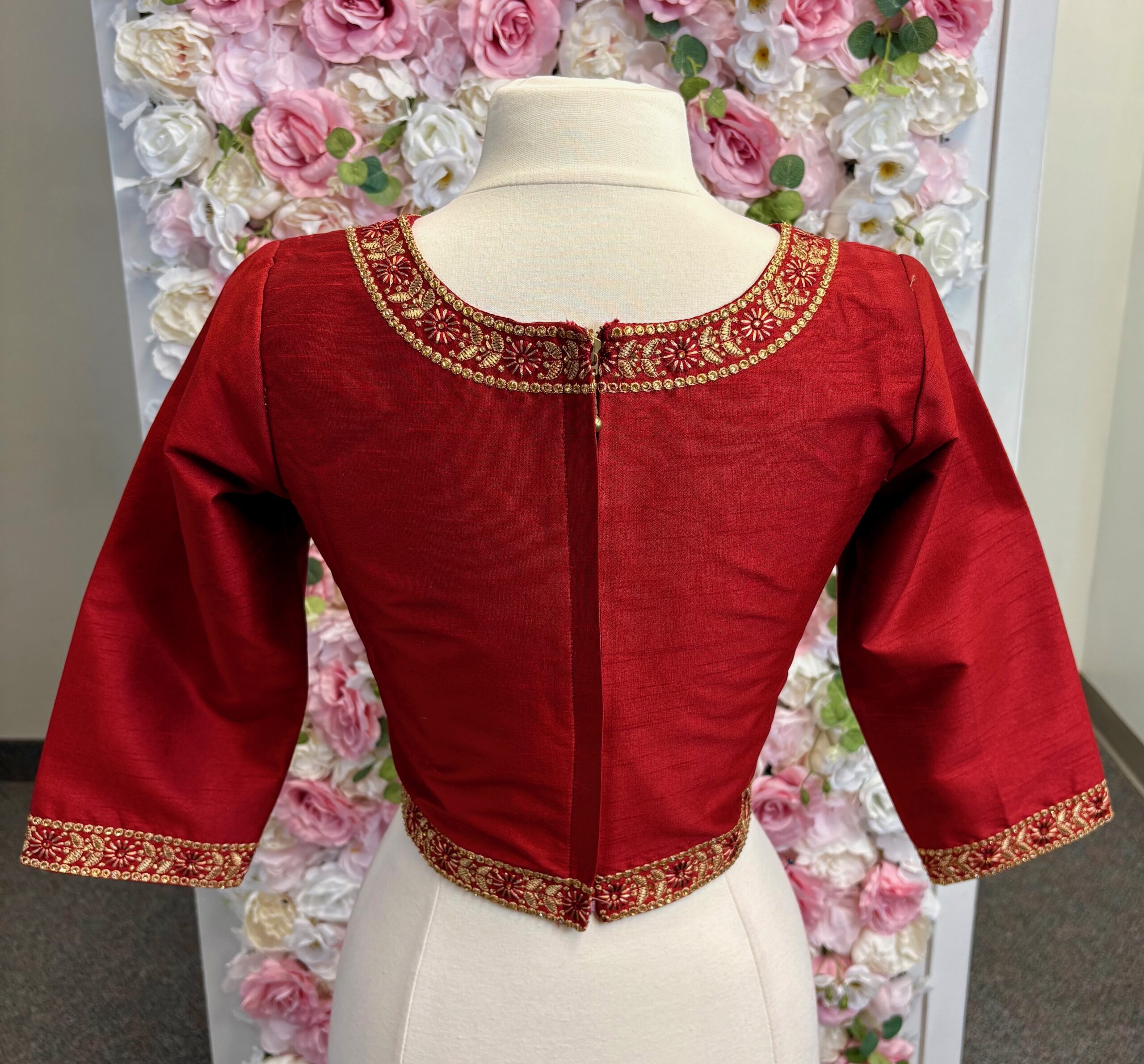 Graceful and timeless, this maroon long sleeve blouse features intricate neck embroidery that adds a touch of elegance to any outfit. Designed in size 38, the blouse can be opened up to 3 sizes larger, providing a flexible and comfortable fit. The secure back zipper closure ensures ease of wear while maintaining a sleek silhouette.