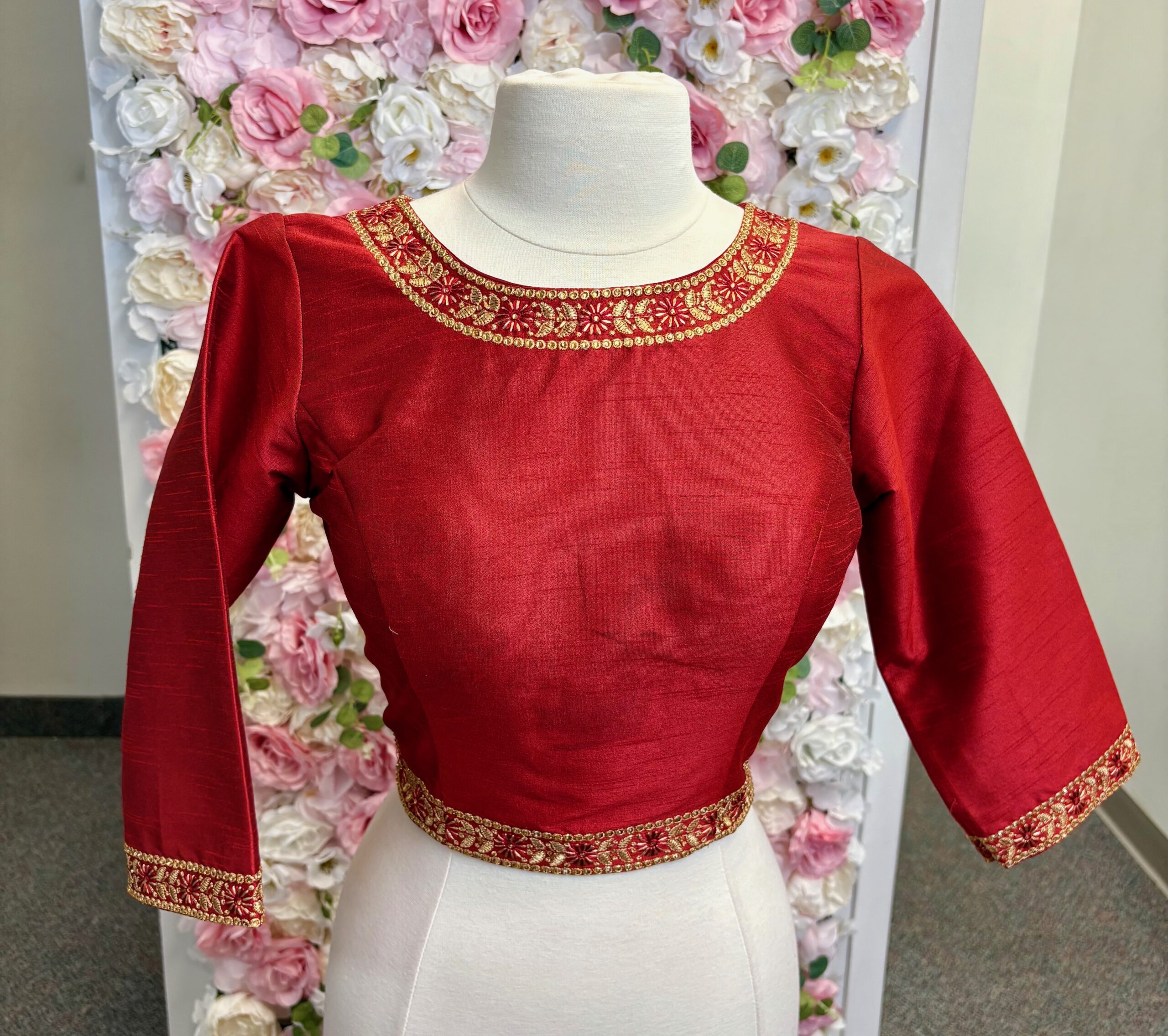 Maroon Long Sleeve Blouse with Neck Embroidery – Size 38 (Expandable Up to 3 Sizes)