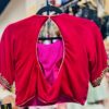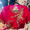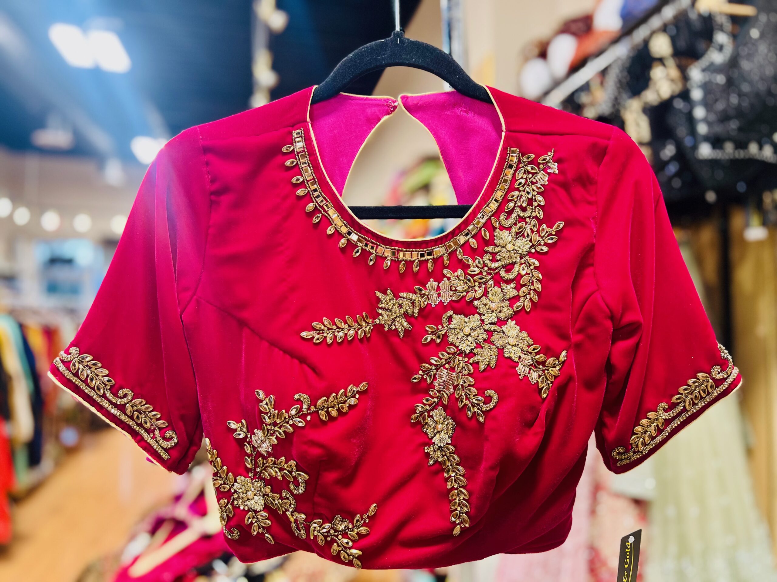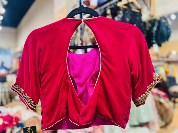 This graceful pinkish red velvet blouse exudes understated sophistication with its subtle embroidered motifs and rich patchwork border design.