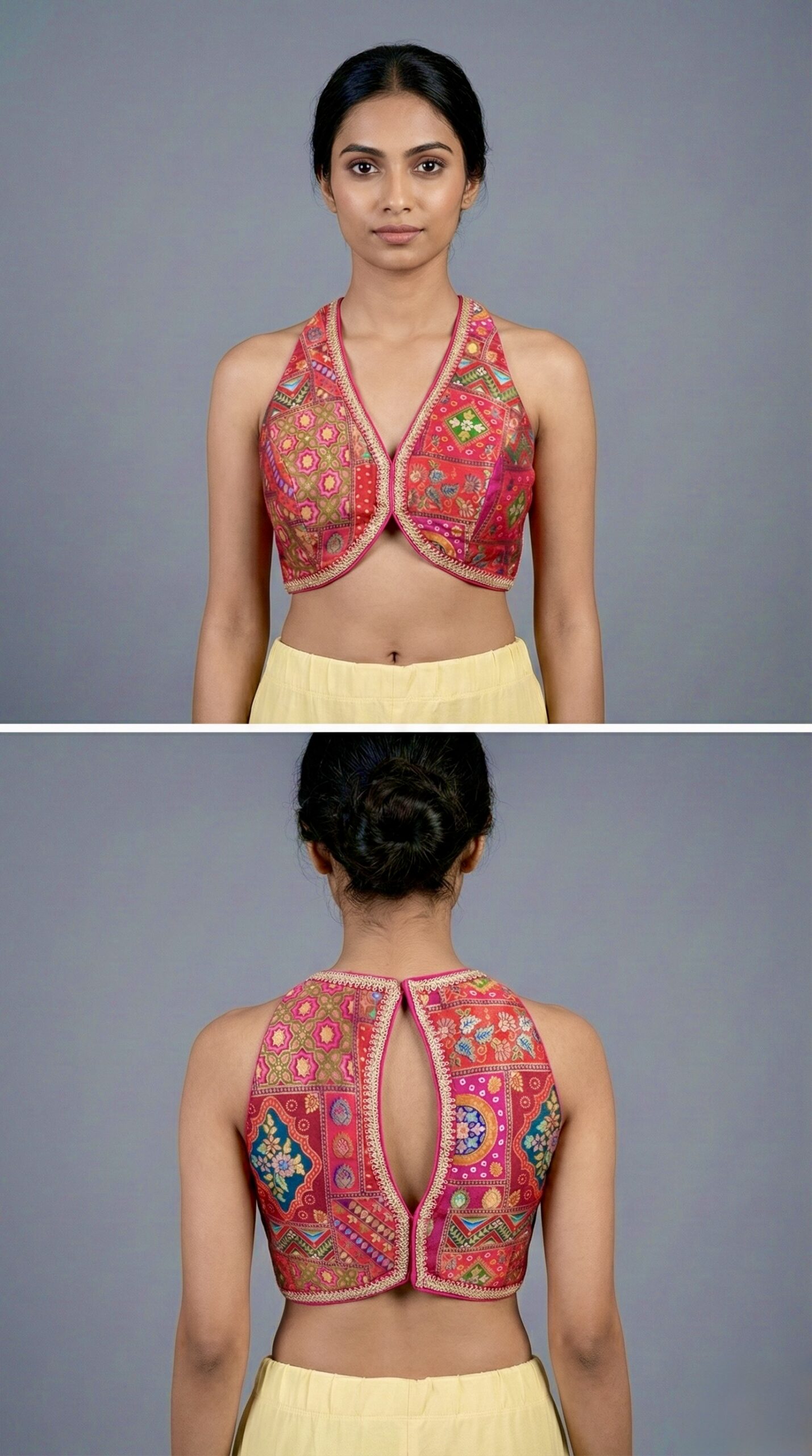 Kutchi Patchwork Backless Blouse is perfect for jewelry lovers and festive