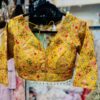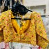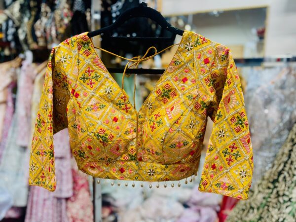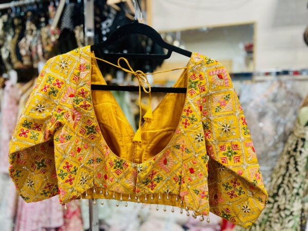 This graceful yellow silk blouse exudes understated sophistication with its subtle embroidered motifs and rich patchwork border design with tassels. The deep neckline with tie-up tassels at the back adds a traditional charm, while the colorful patch detailing on the sleeves and waistline brings a vibrant ethnic touch. Perfect for pairing with sarees or lehengas, this blouse beautifully balances simplicity and elegance — ideal for festive occasions, cultural events, or wedding celebrations.