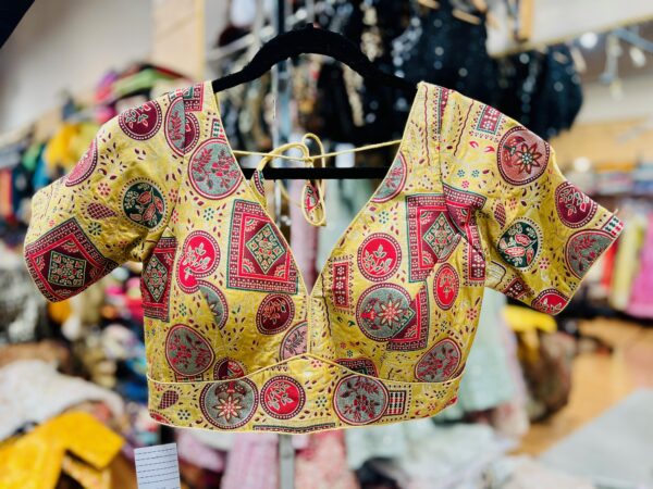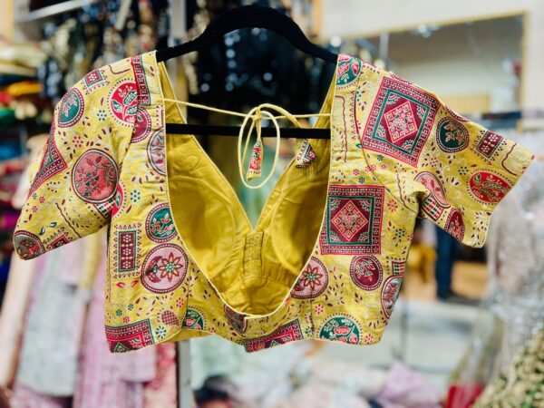 This graceful silk blouse exudes understated sophistication with its subtle printed motifs. The deep neckline with tie-up tassels at the back adds a traditional charm, while the colorful detailing on the sleeves and waistline brings a vibrant ethnic touch. Perfect for pairing with sarees or lehengas, this blouse beautifully balances simplicity and elegance — ideal for festive occasions, cultural events, or wedding celebrations.