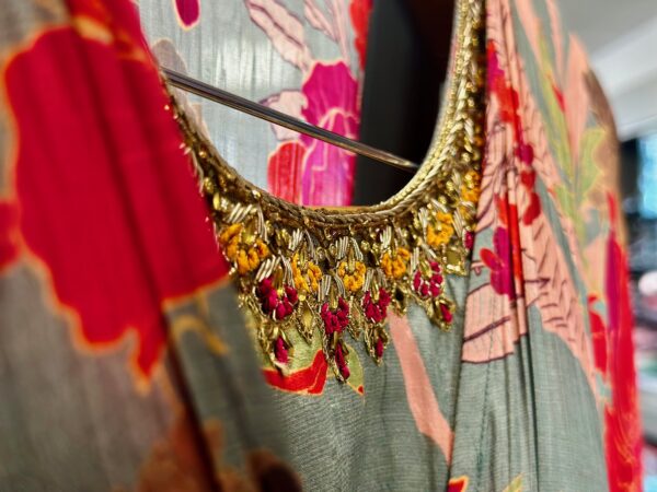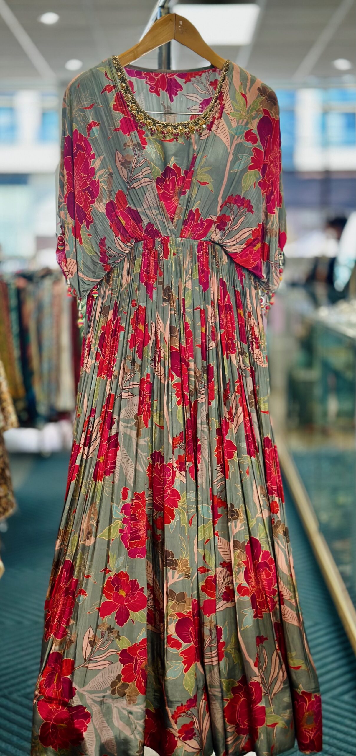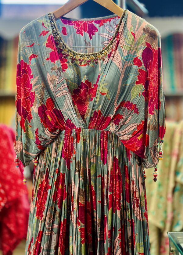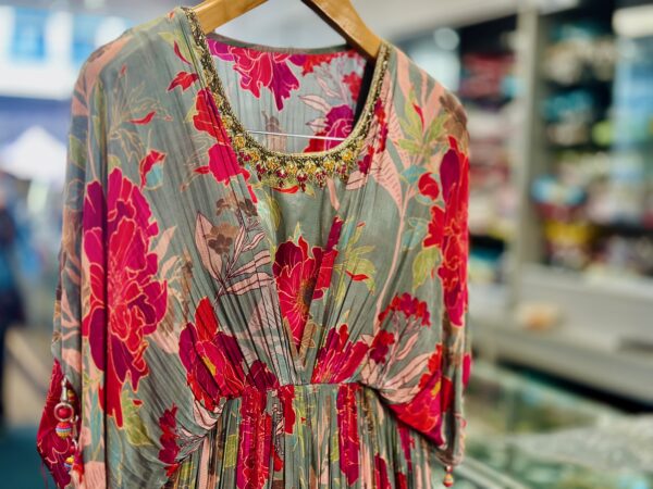 Make a graceful statement with this elegant printed gown featuring a sophisticated blend of grey and vibrant magenta hues. Designed in size 34, the gown offers a flattering fit with a flowing silhouette that enhances your natural elegance. Perfect for formal events, evening parties, or special occasions, this gown combines classic charm with contemporary style.